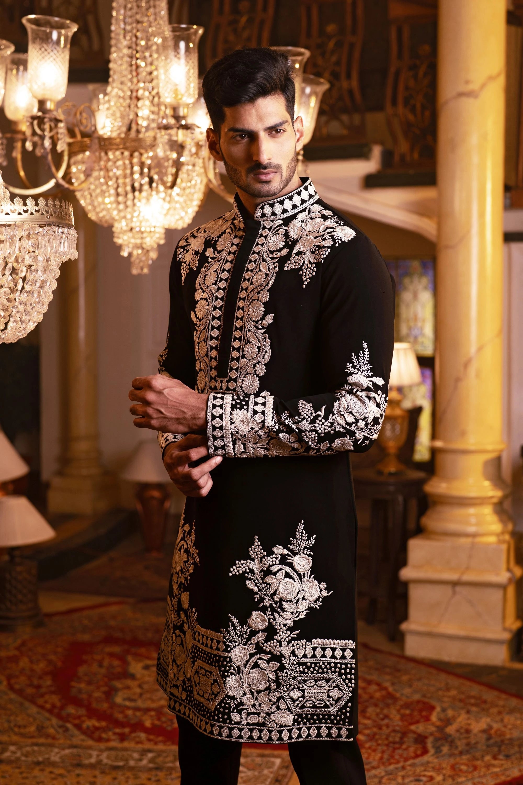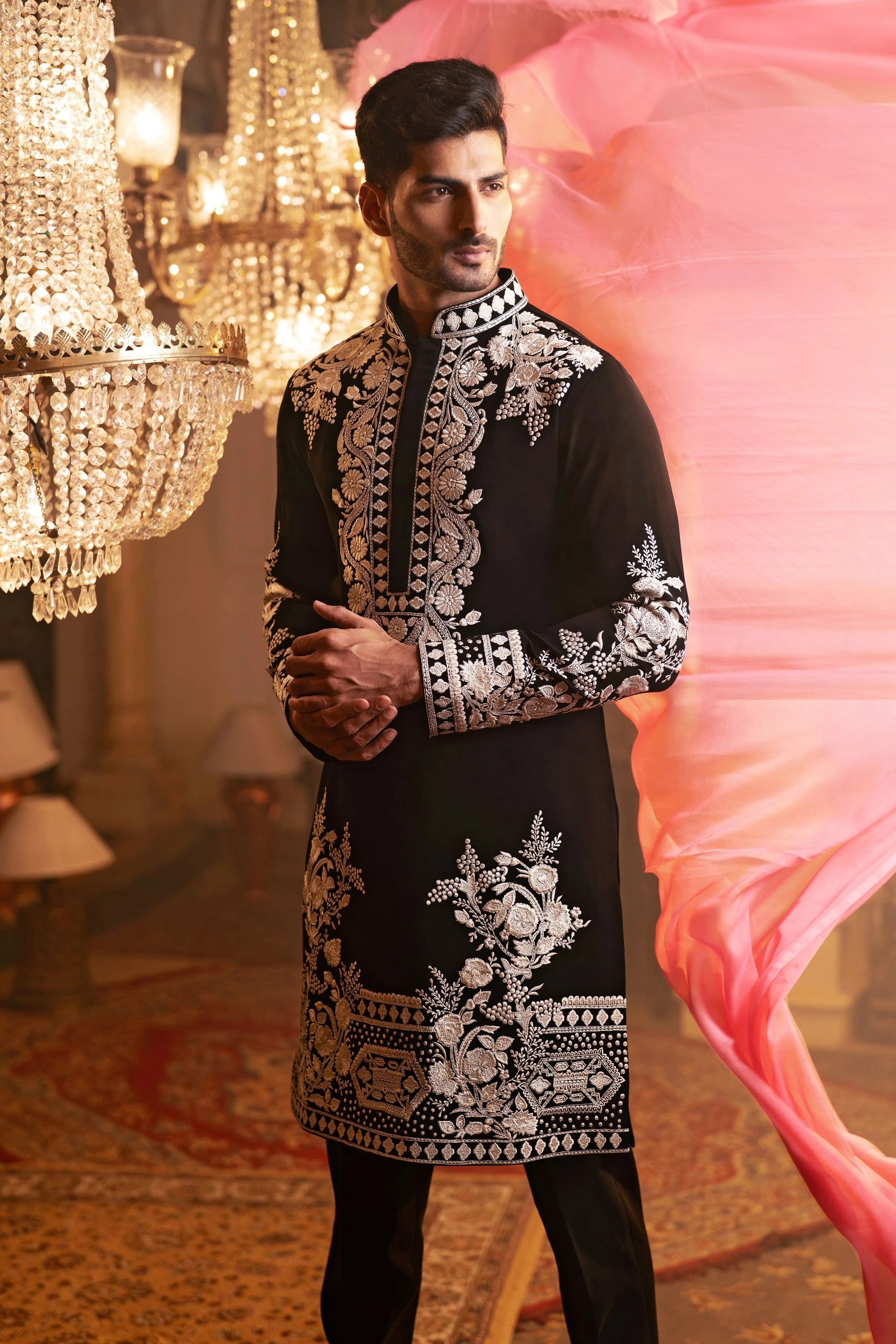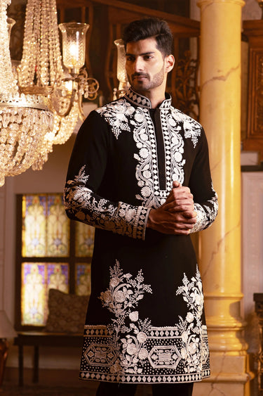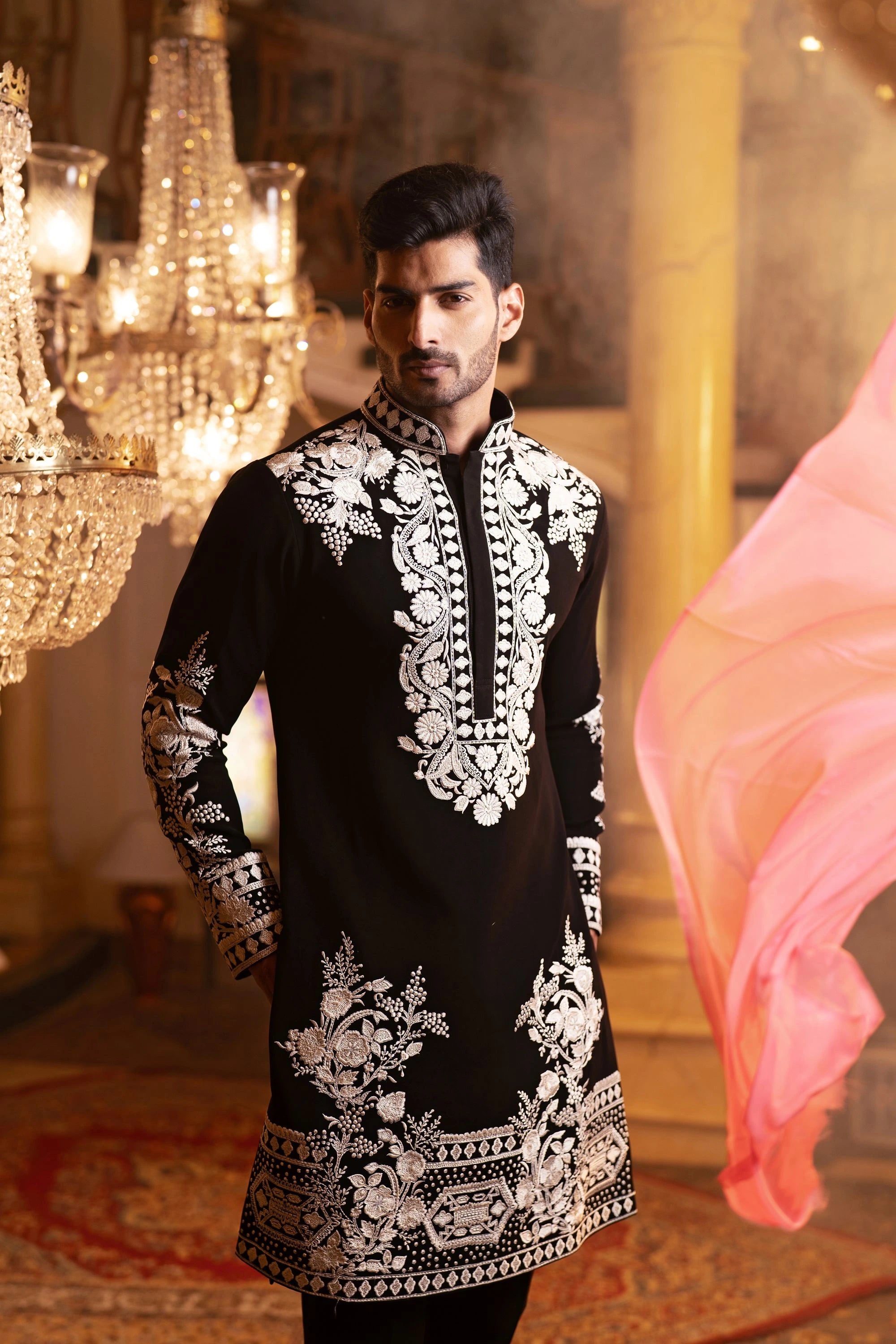 Men’s Black Meghna Fabric Kurta with Fine White Resham Floral Handwork