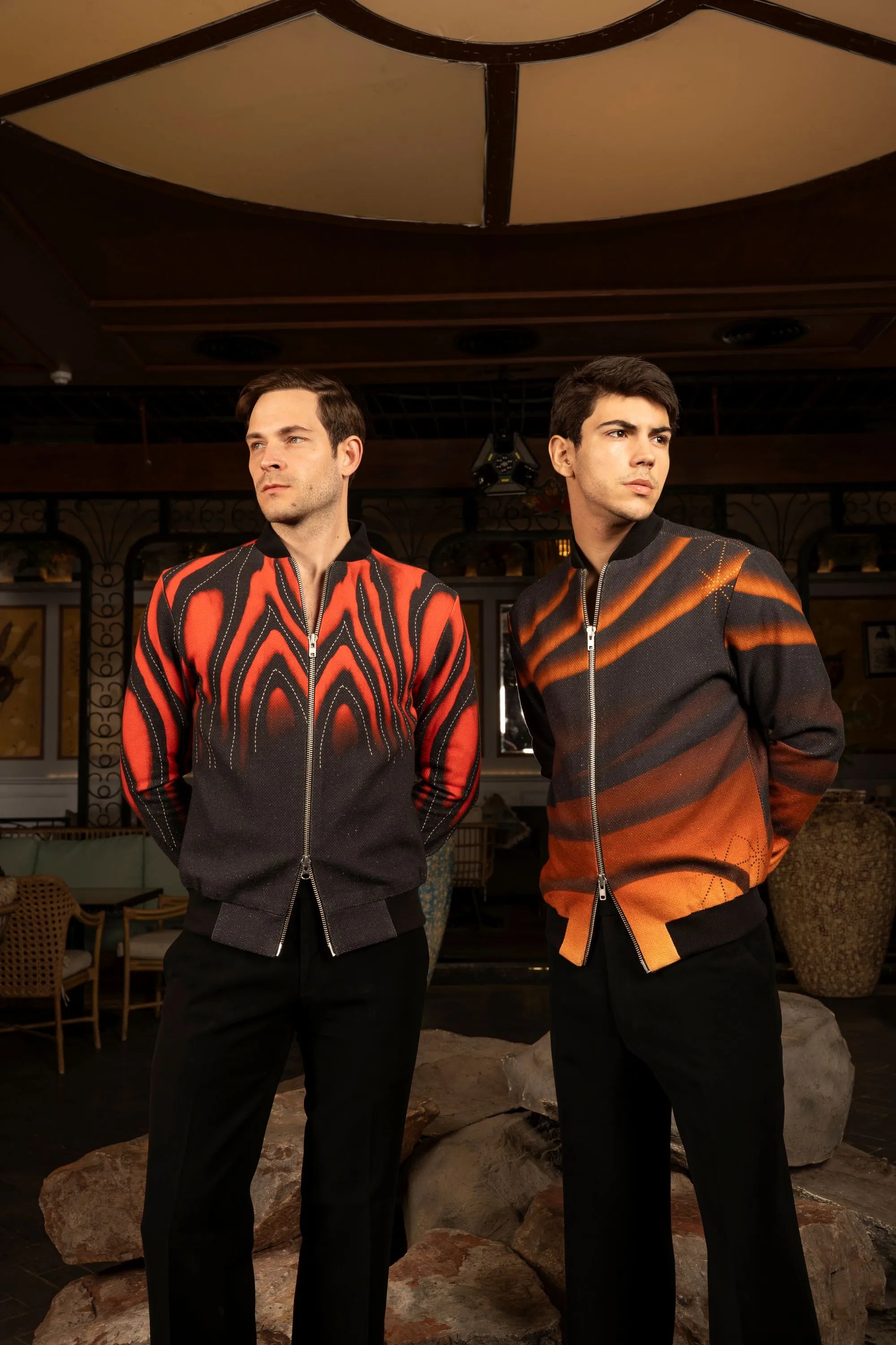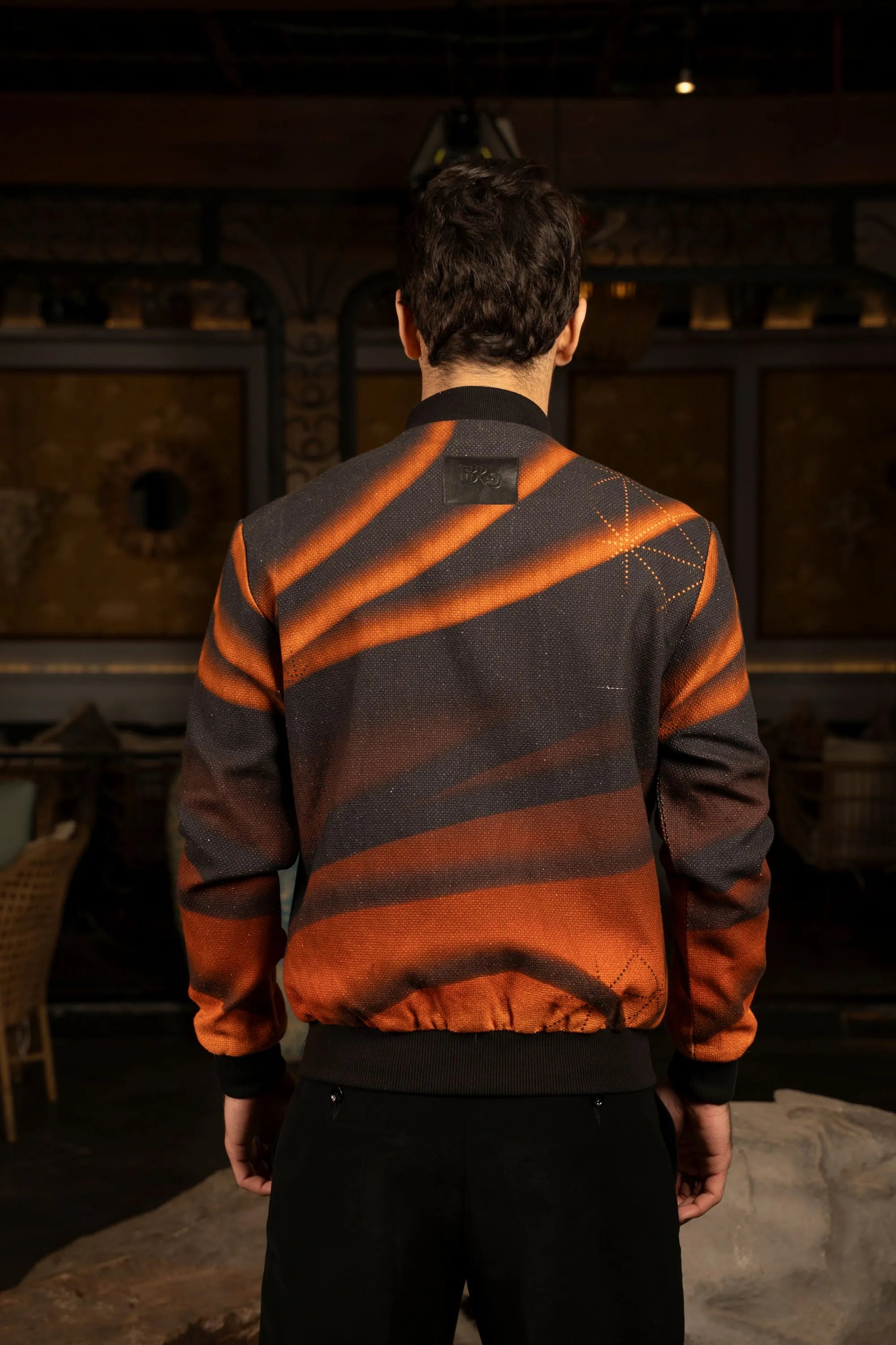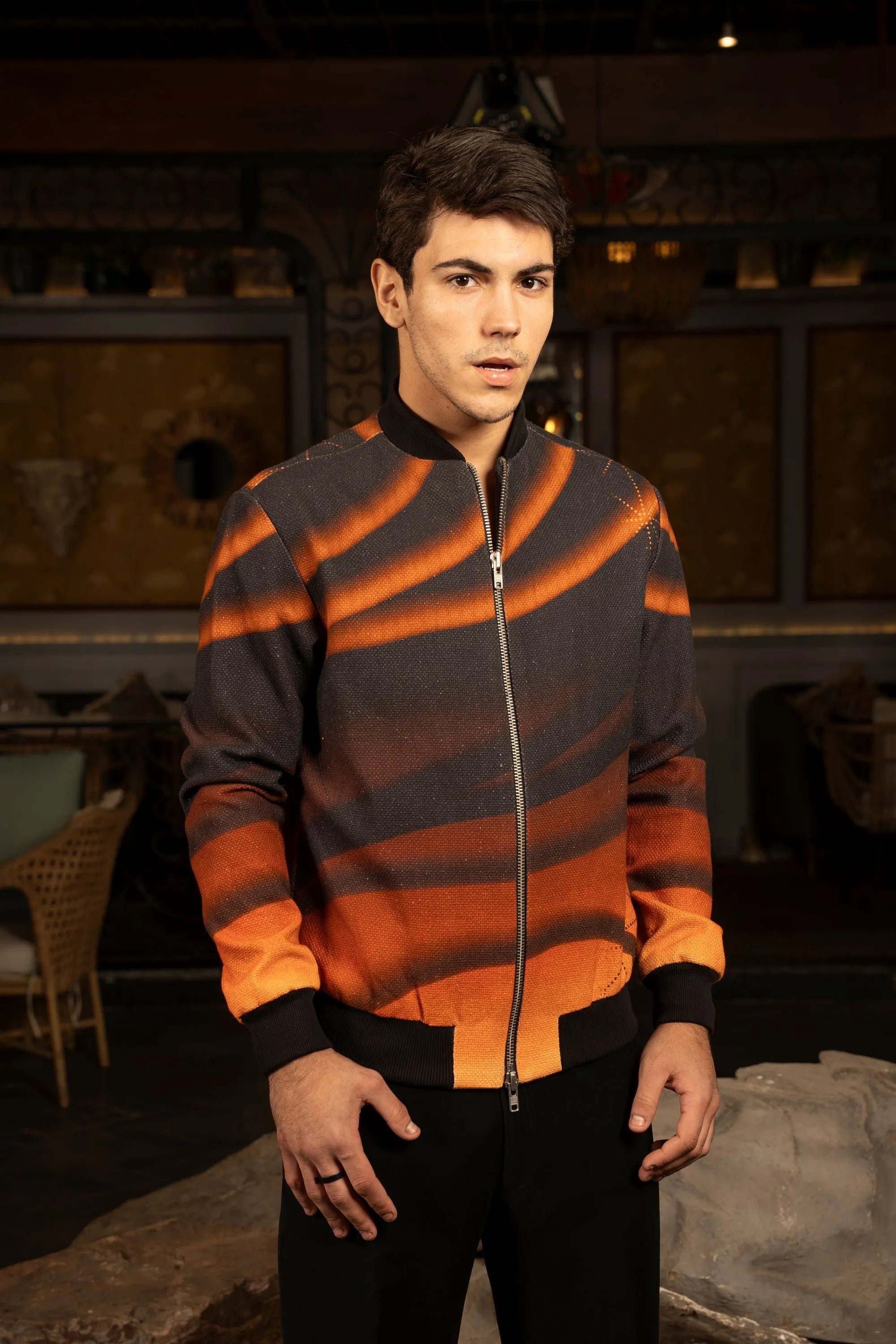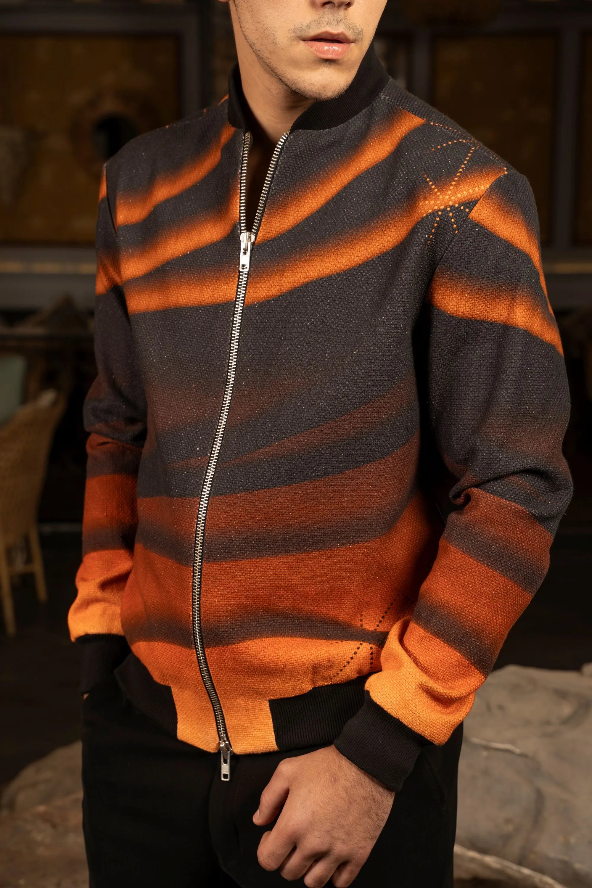 Exclusive digital print jacket featuring a ribbed design and a striking sunset-to-dawn gradient effect for a bold, contemporary statement.