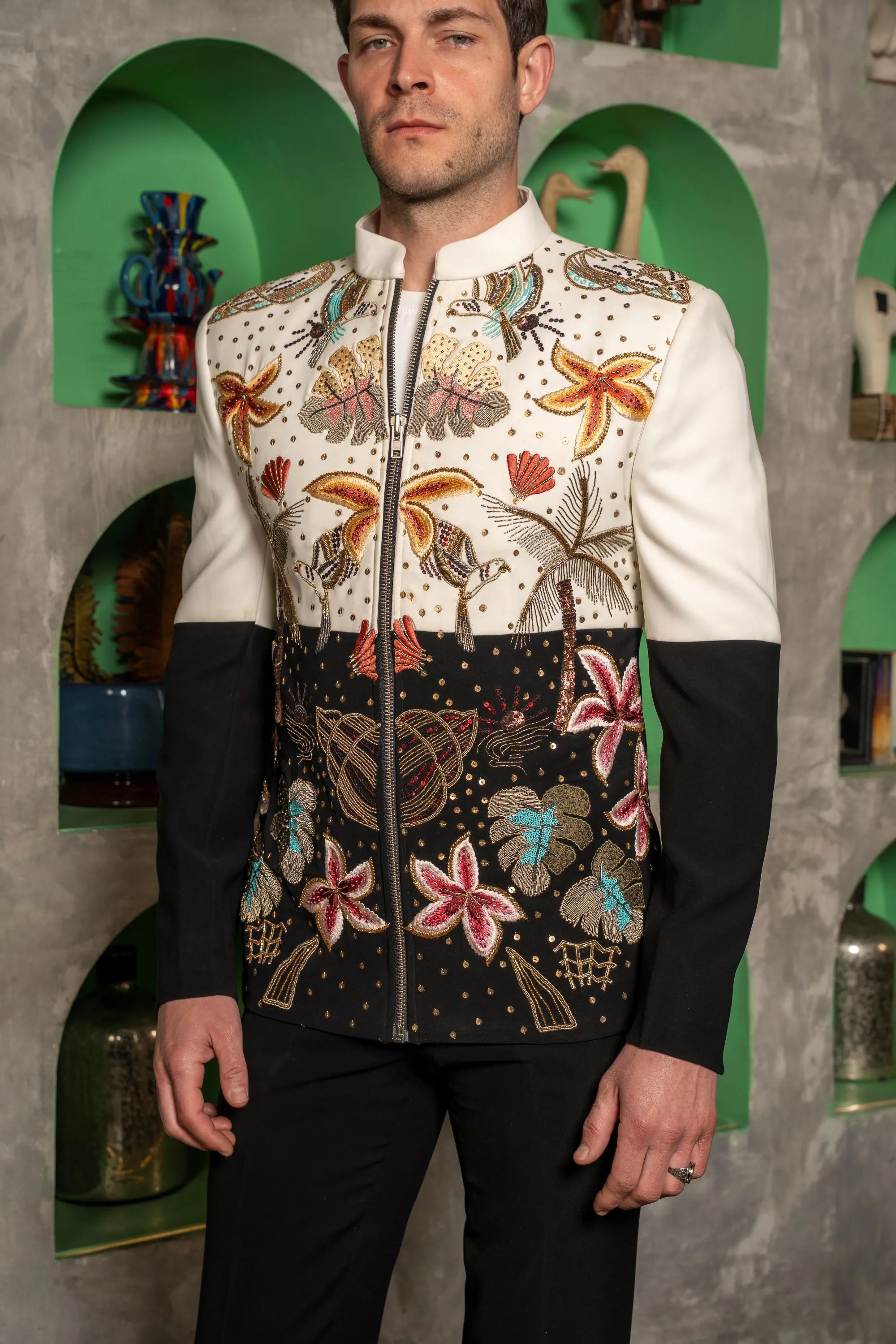 Half-and-half black and white bandhgala jacket with a zipper, adorned with vibrant multicolour motifs for a striking, contemporary look.