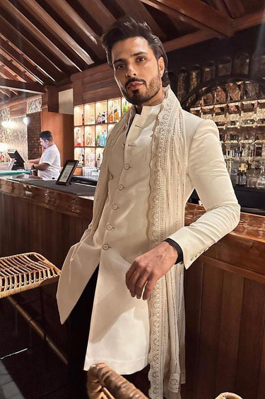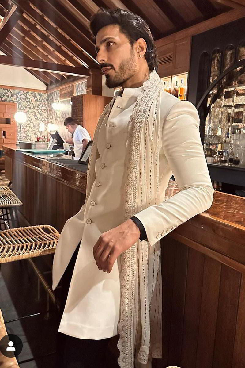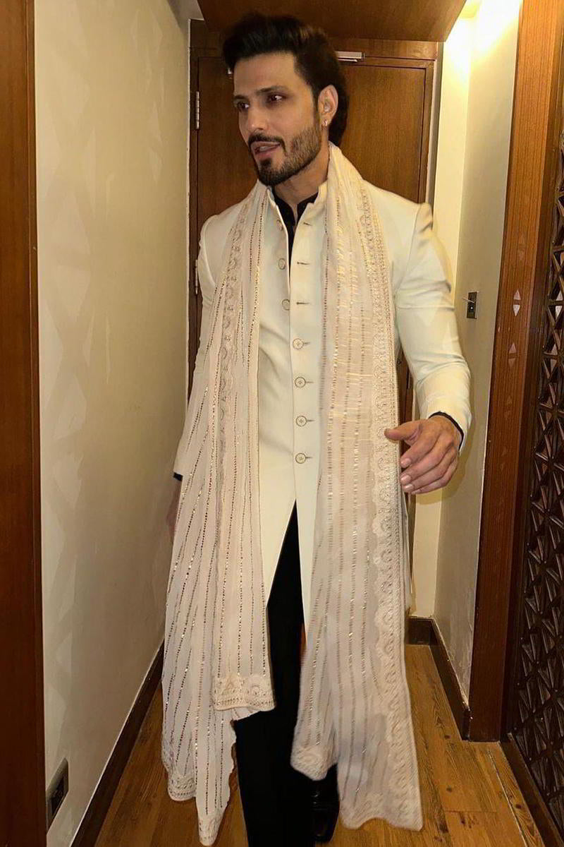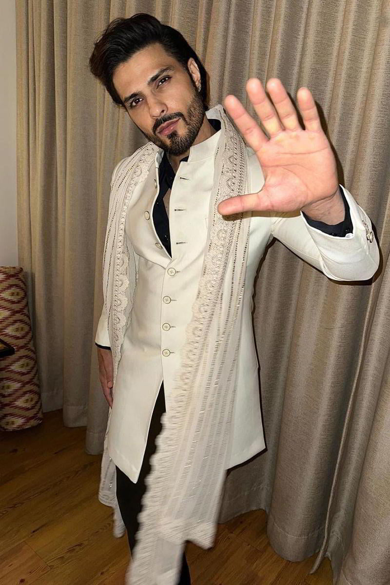 Vin Rana looks elegant in our off-white self-textured designer Indo-Western for men - blending subtle sophistication with modern ethnic style. Shop now.
