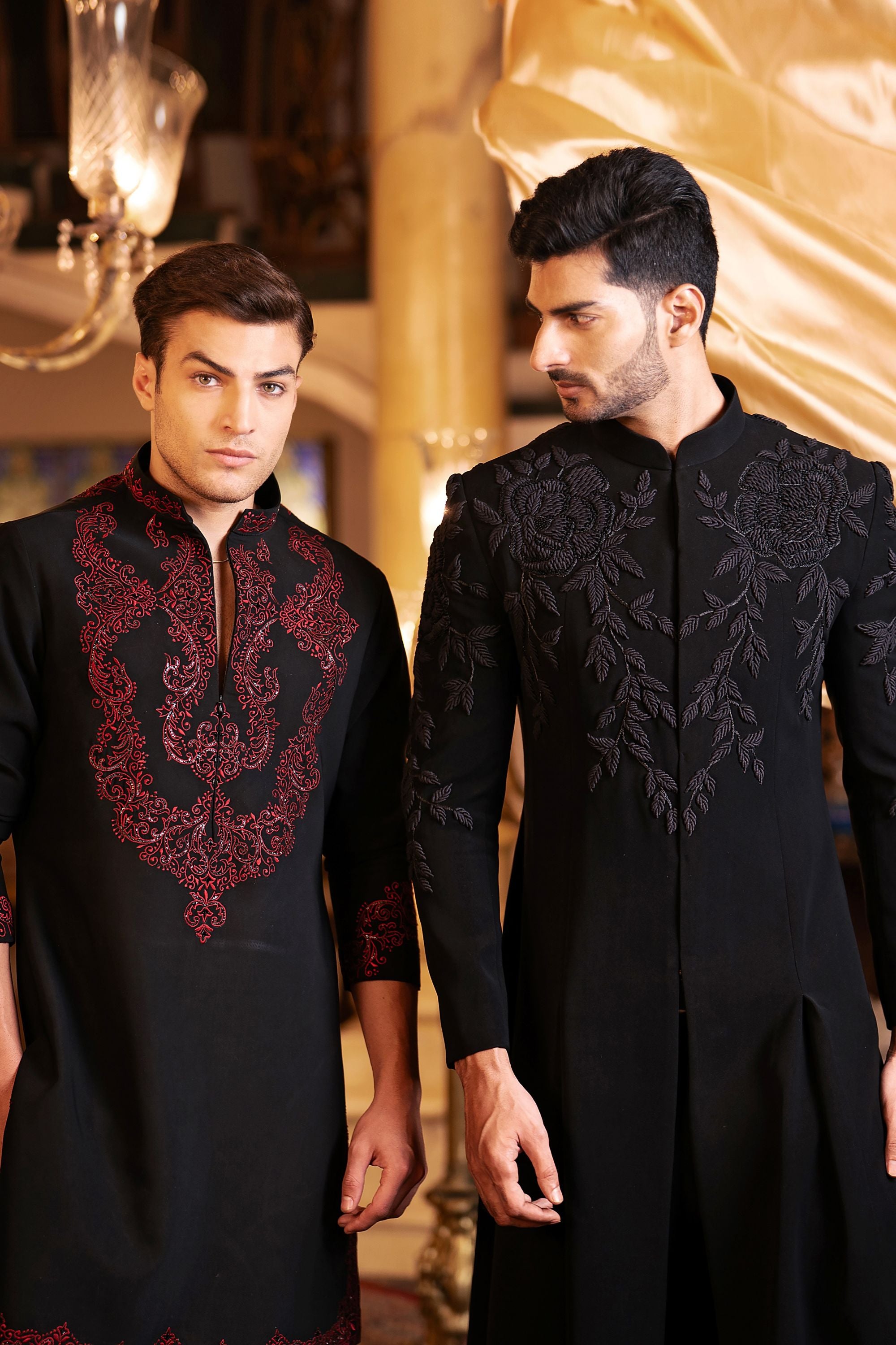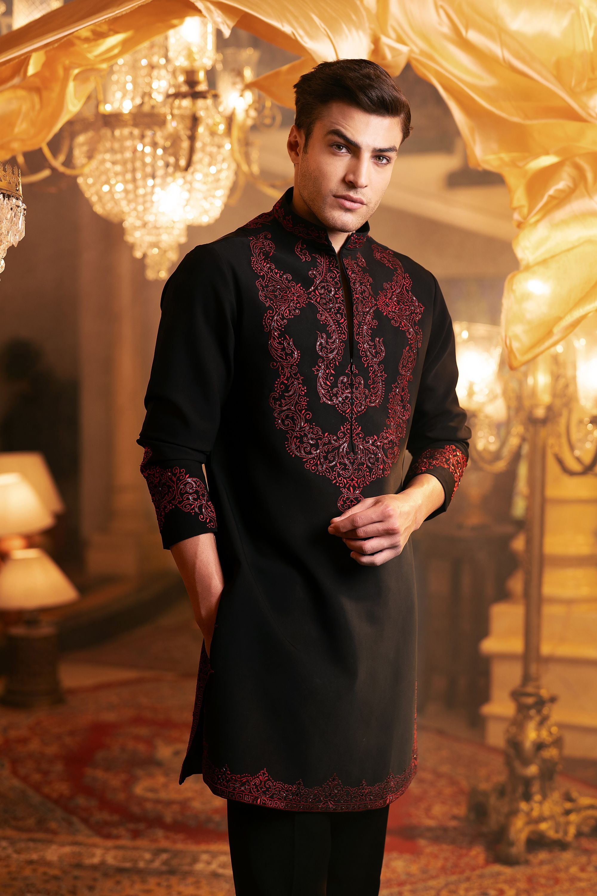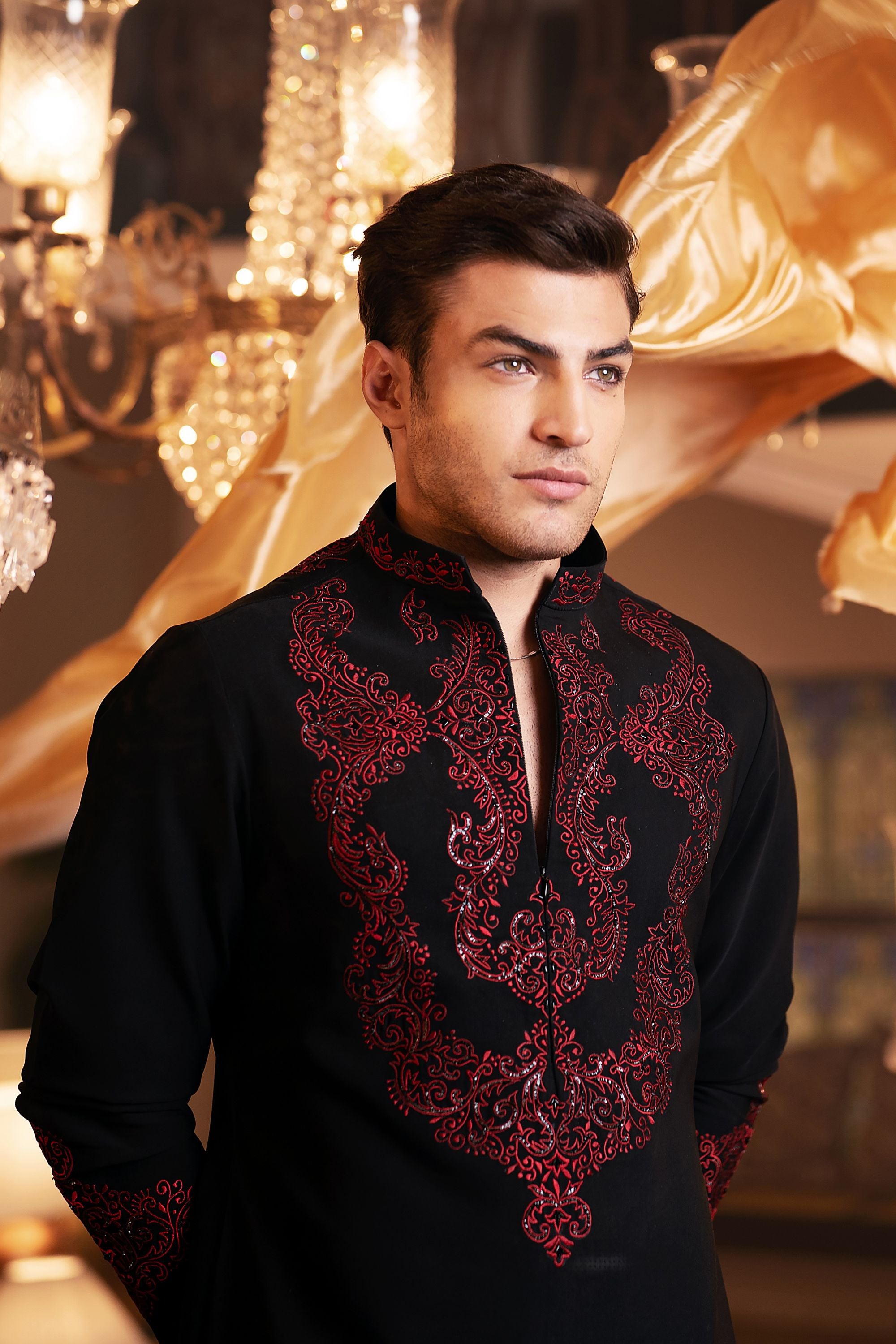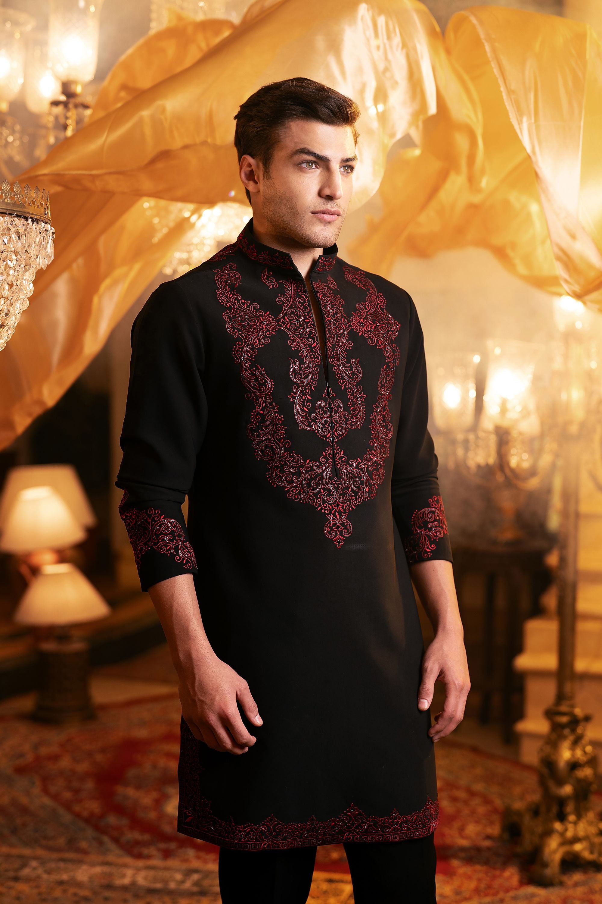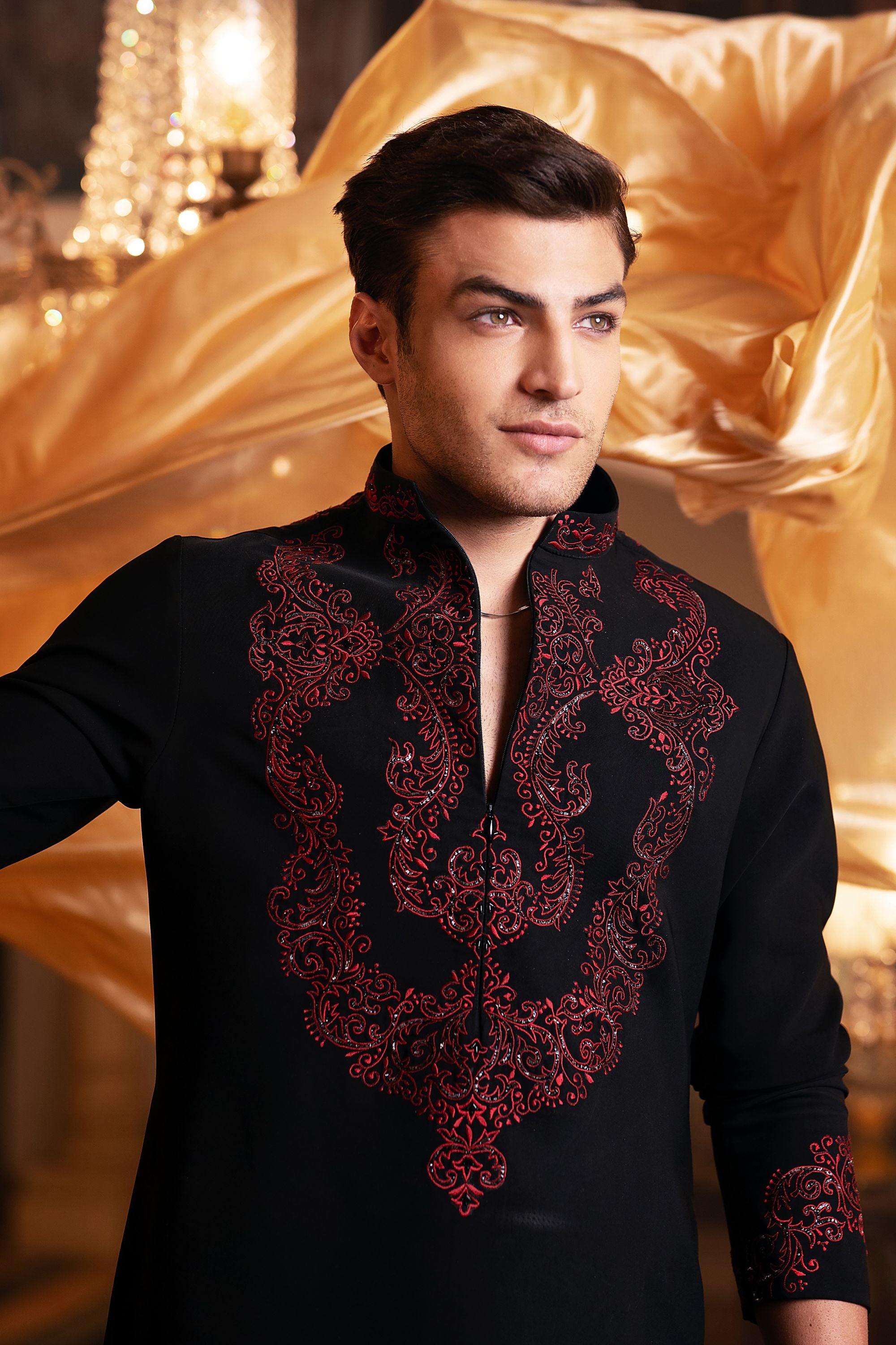 Men’s Black Magna Fabric Kurta with Red Thread, Moti & Cut-Dana Handwork