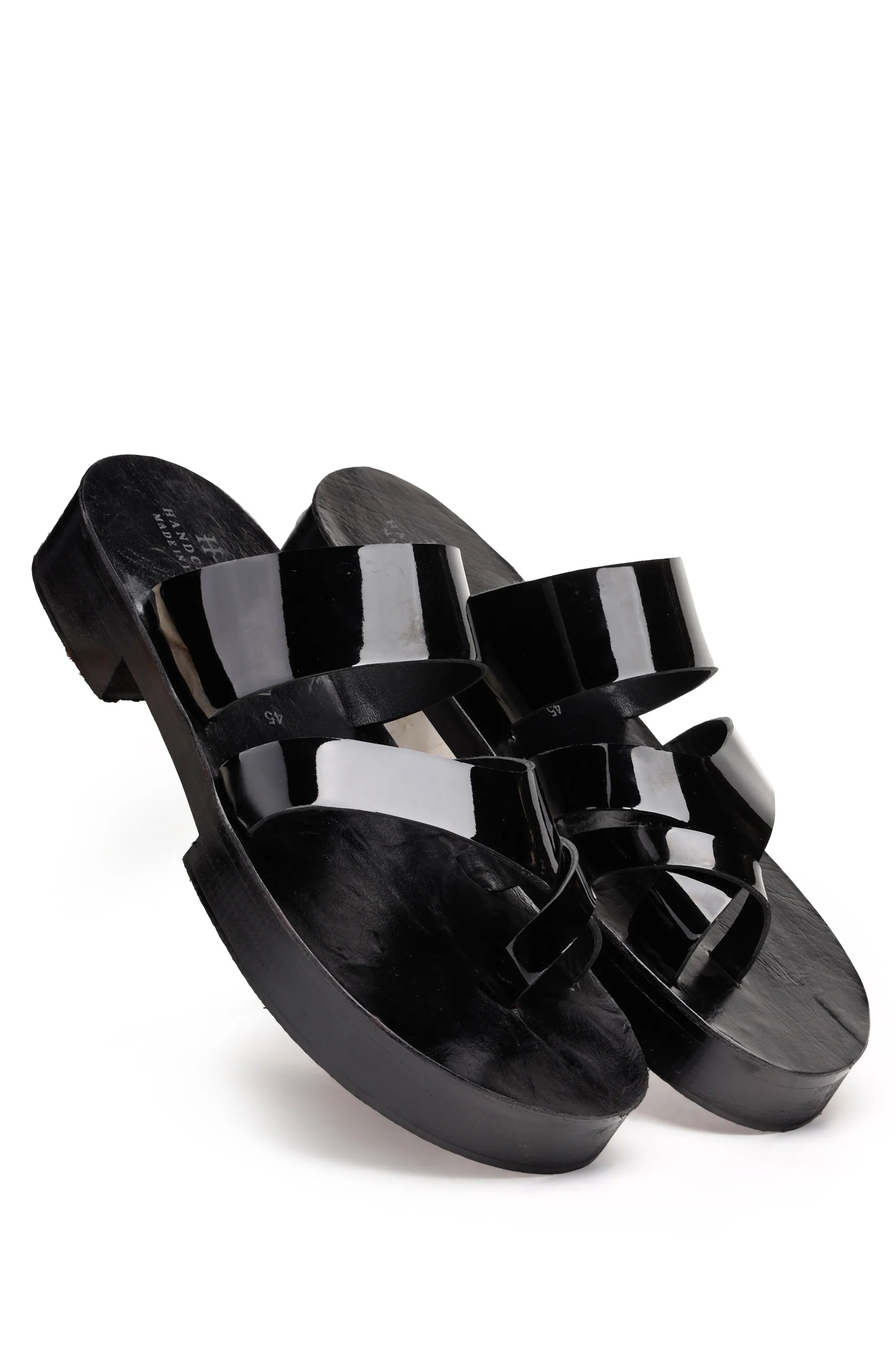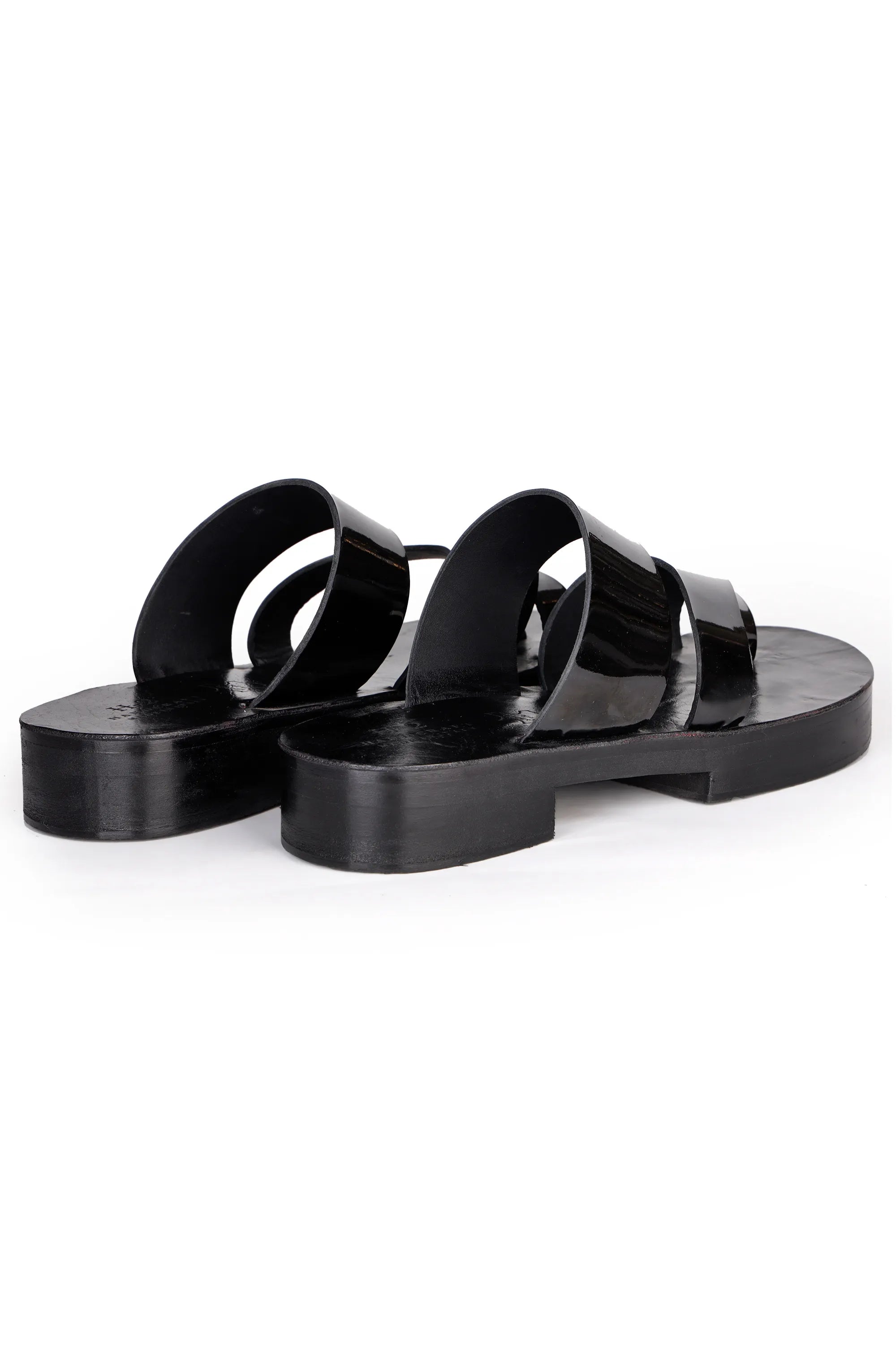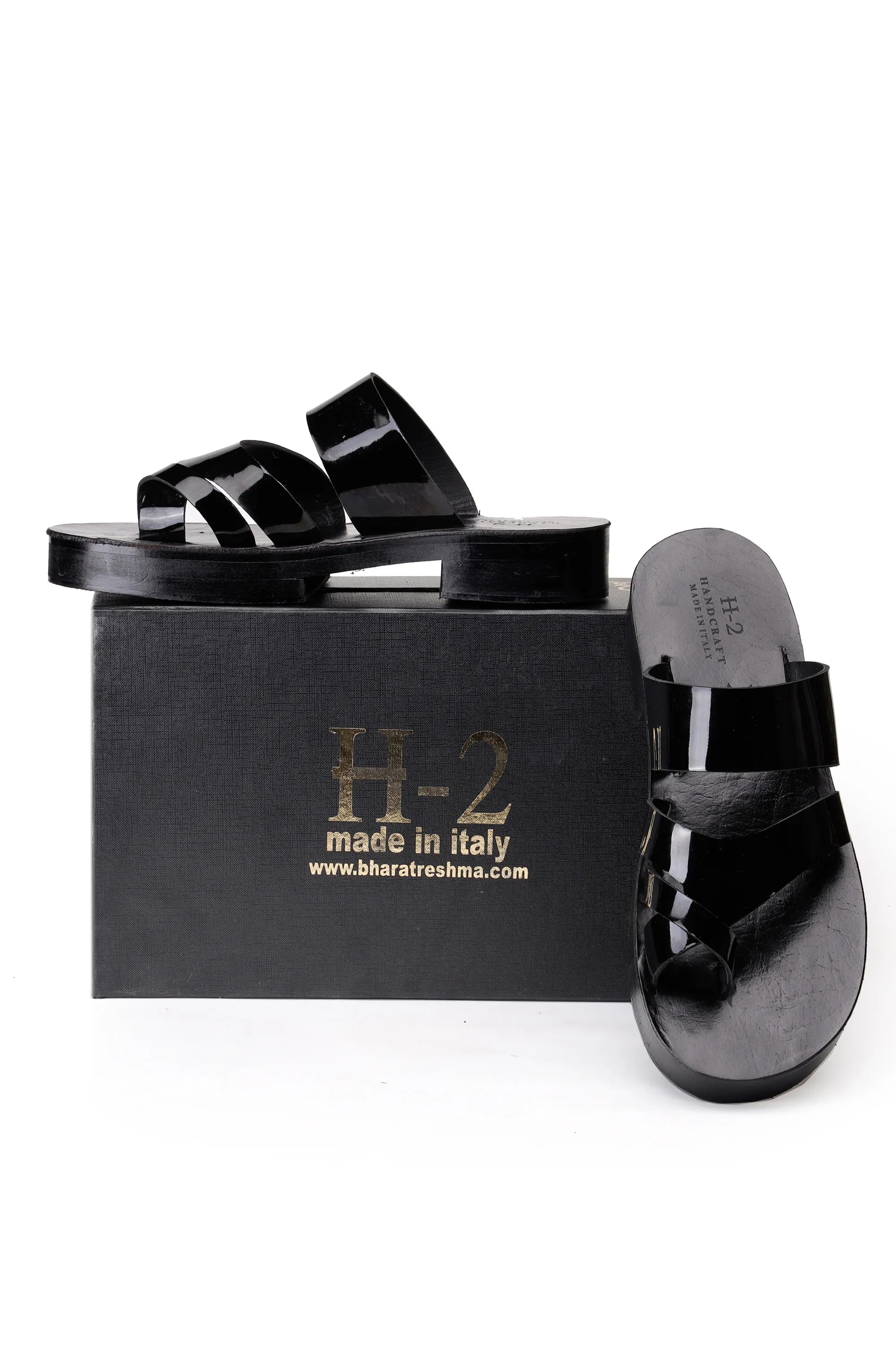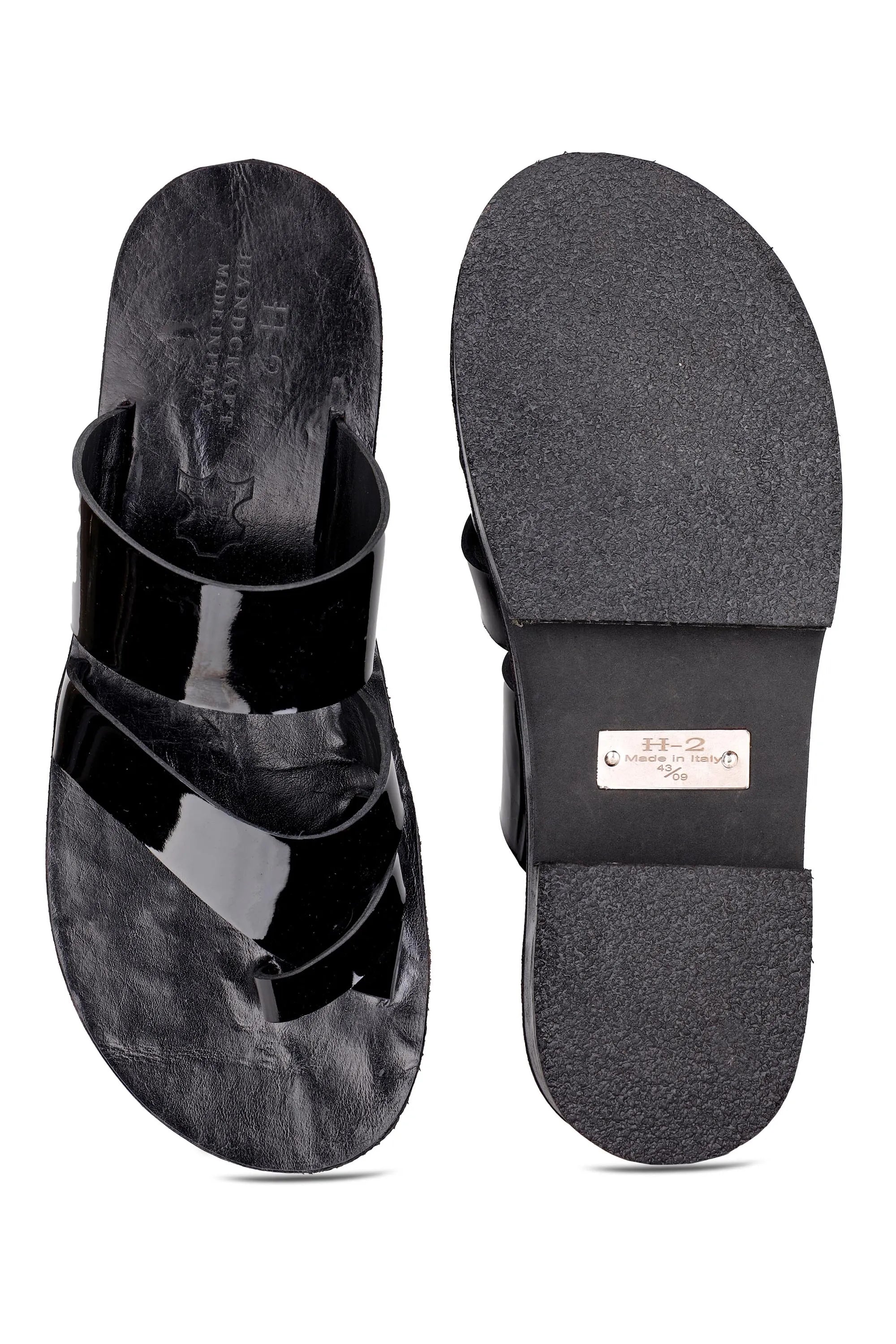 these Italian slippers feature a sleek black glossy pure-leather design with a comfortable raised heel and a modern triple-strap upper. Stylish, durable, and easy to pair with casual or smart outfits, they offer a premium look with all-day comfort.