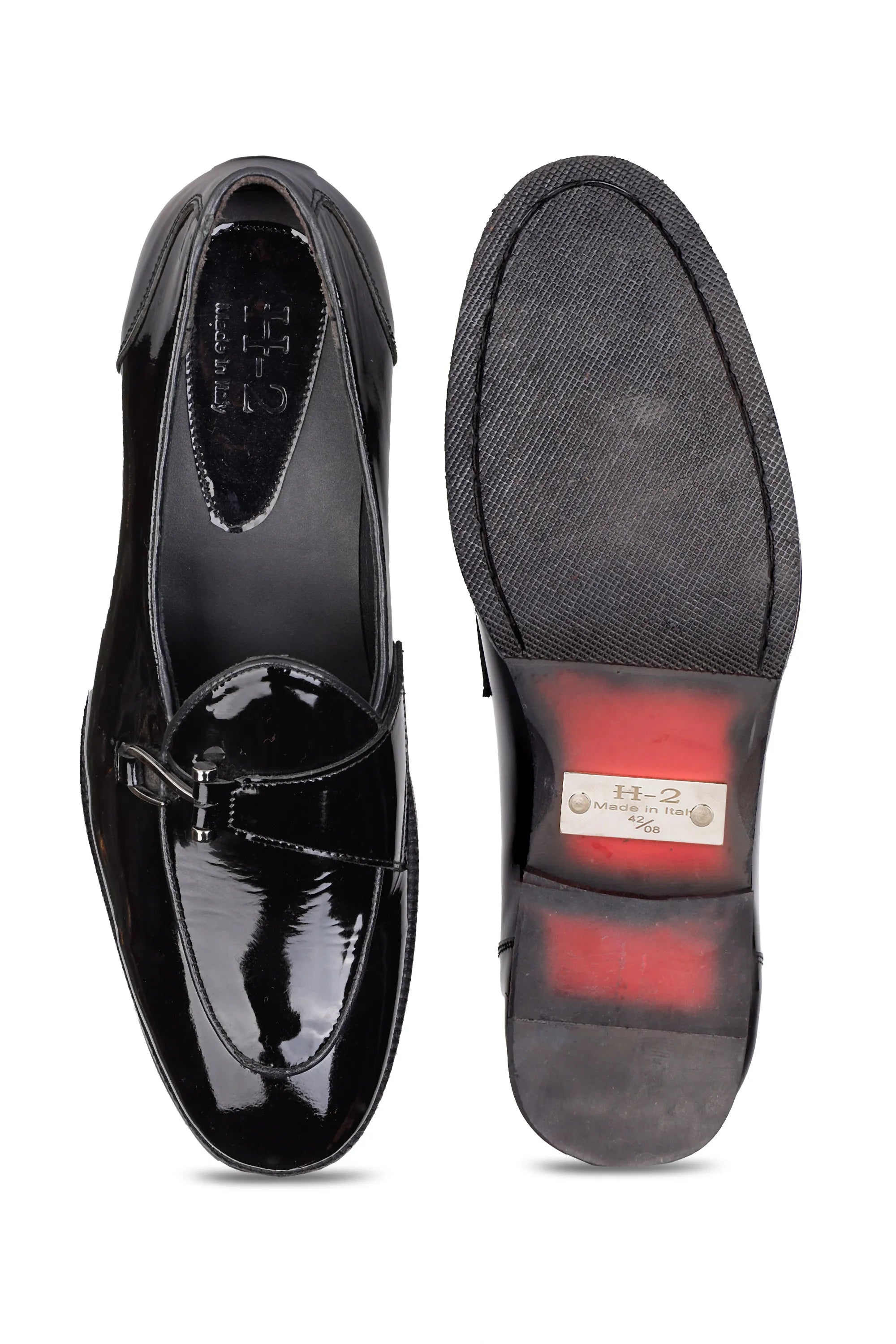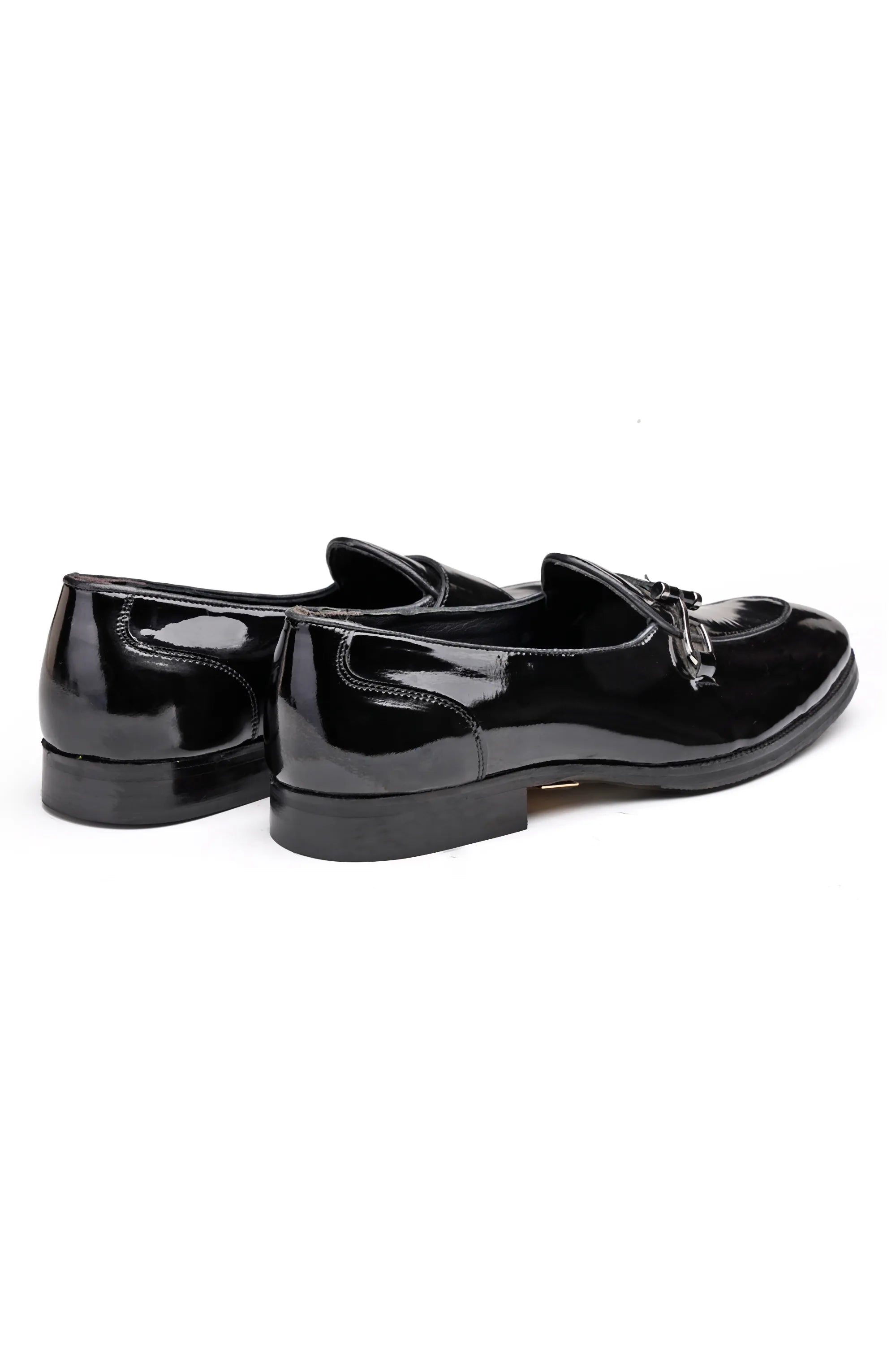 Black Patent Leather Cross-Strap Bit Loafers For Men