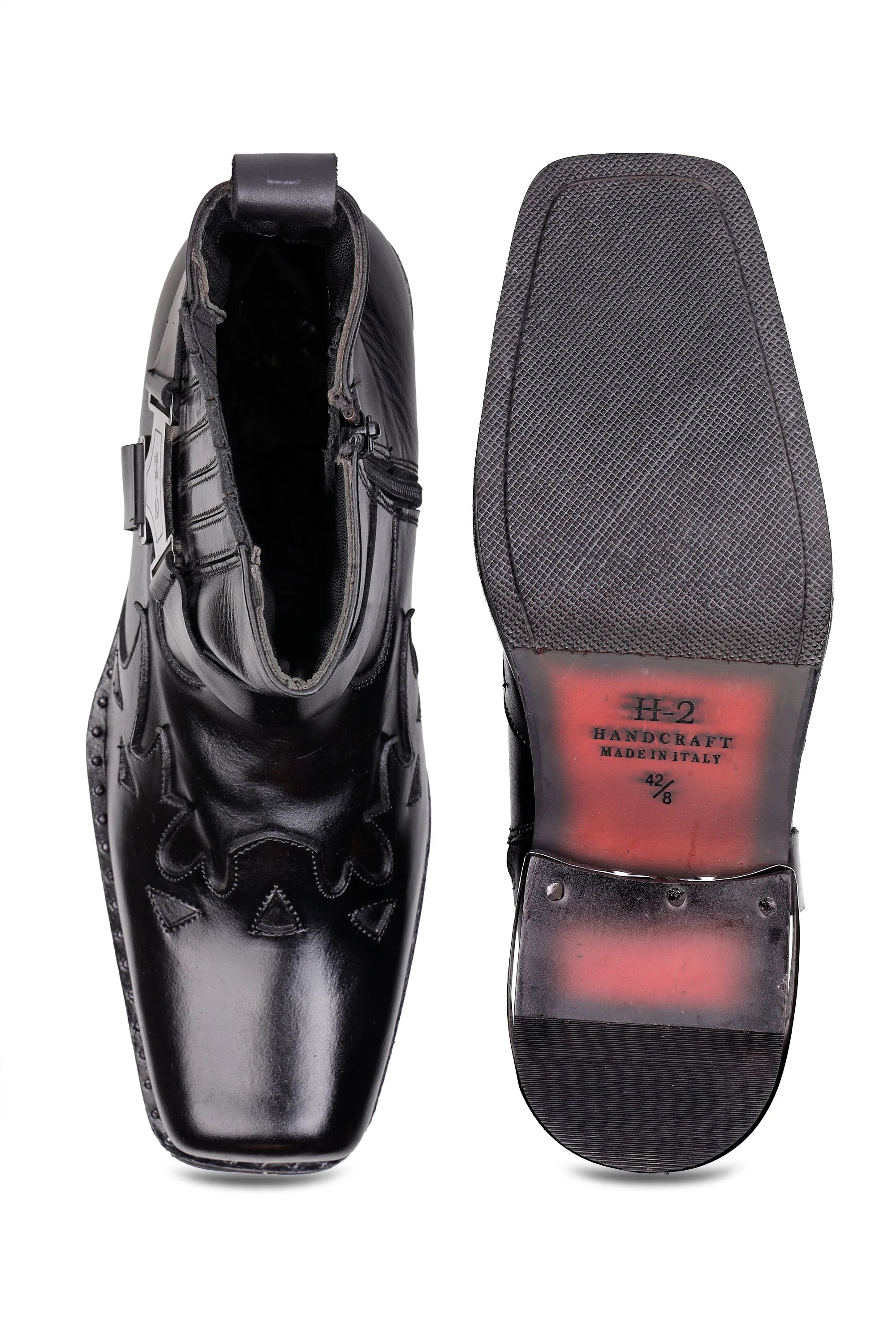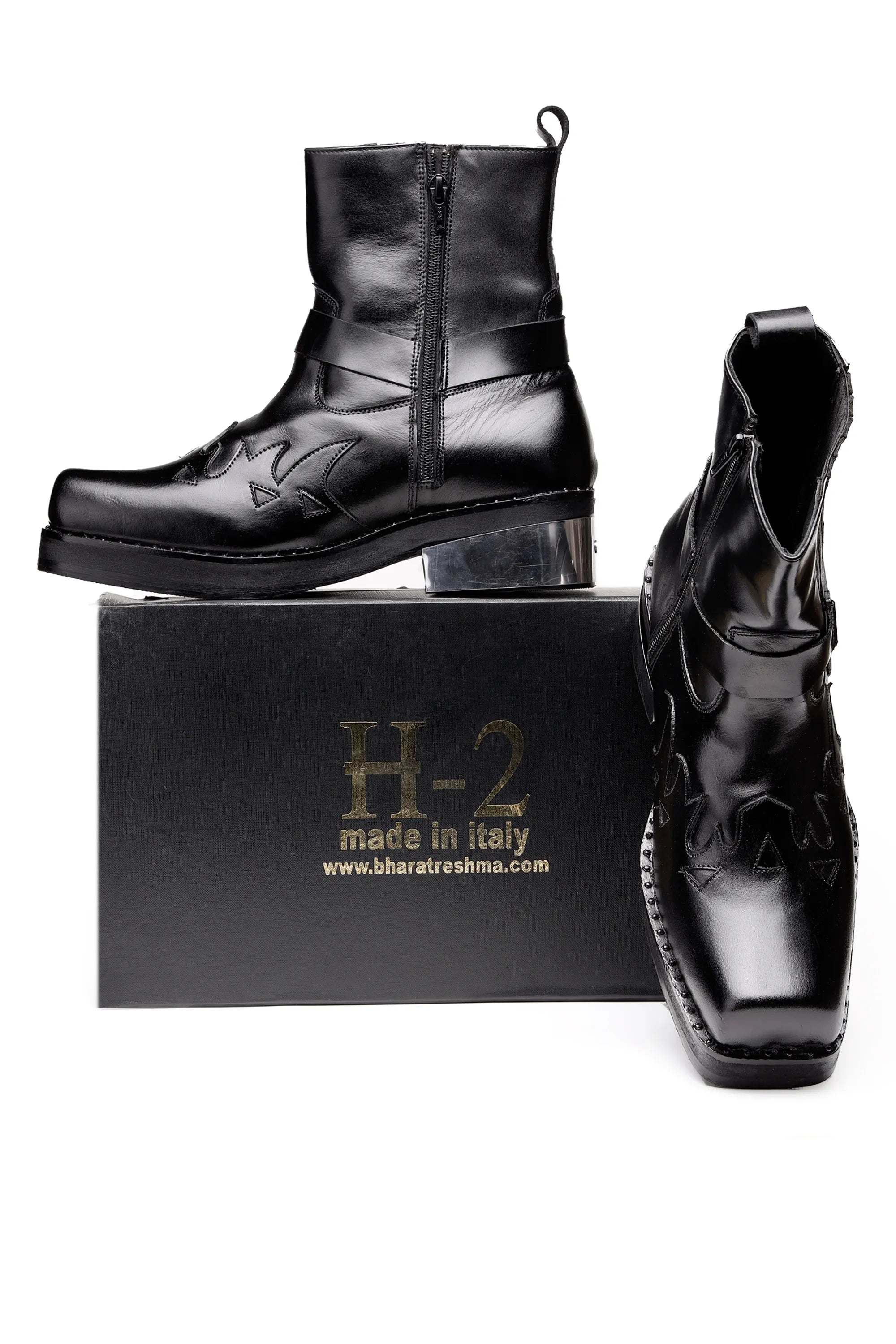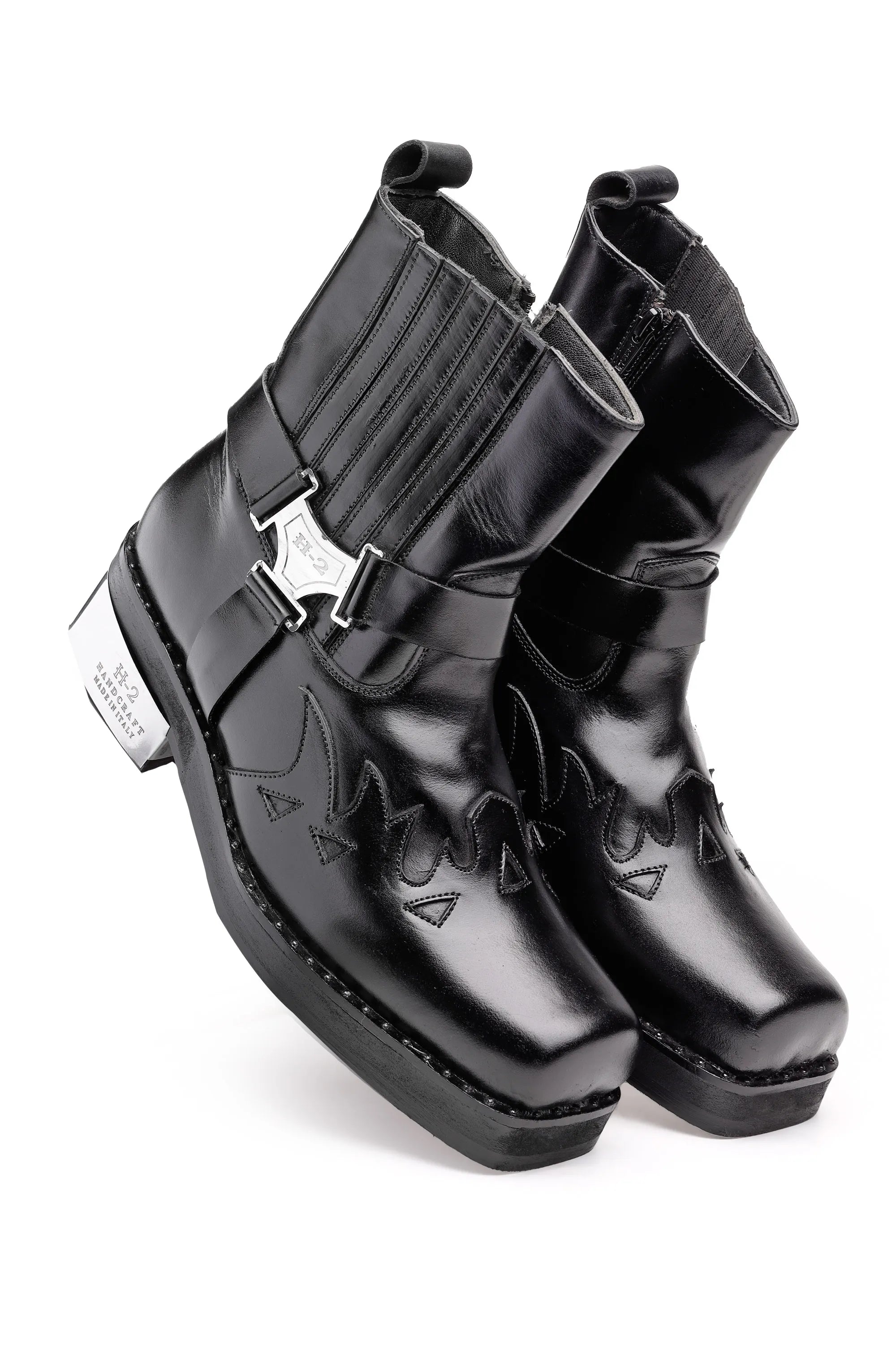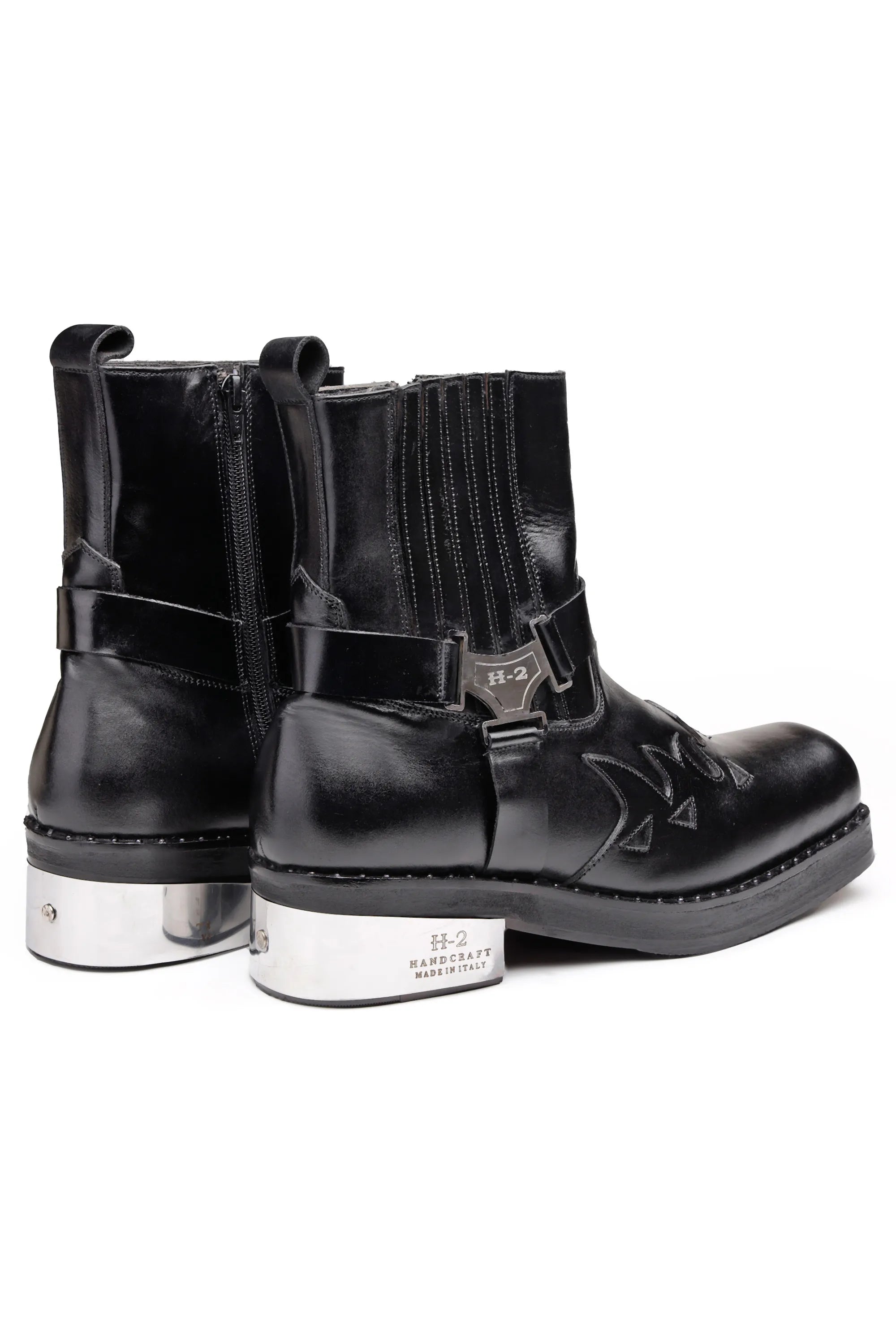Black Pure Leather Fire-Design Boots with Metal Harness Detail