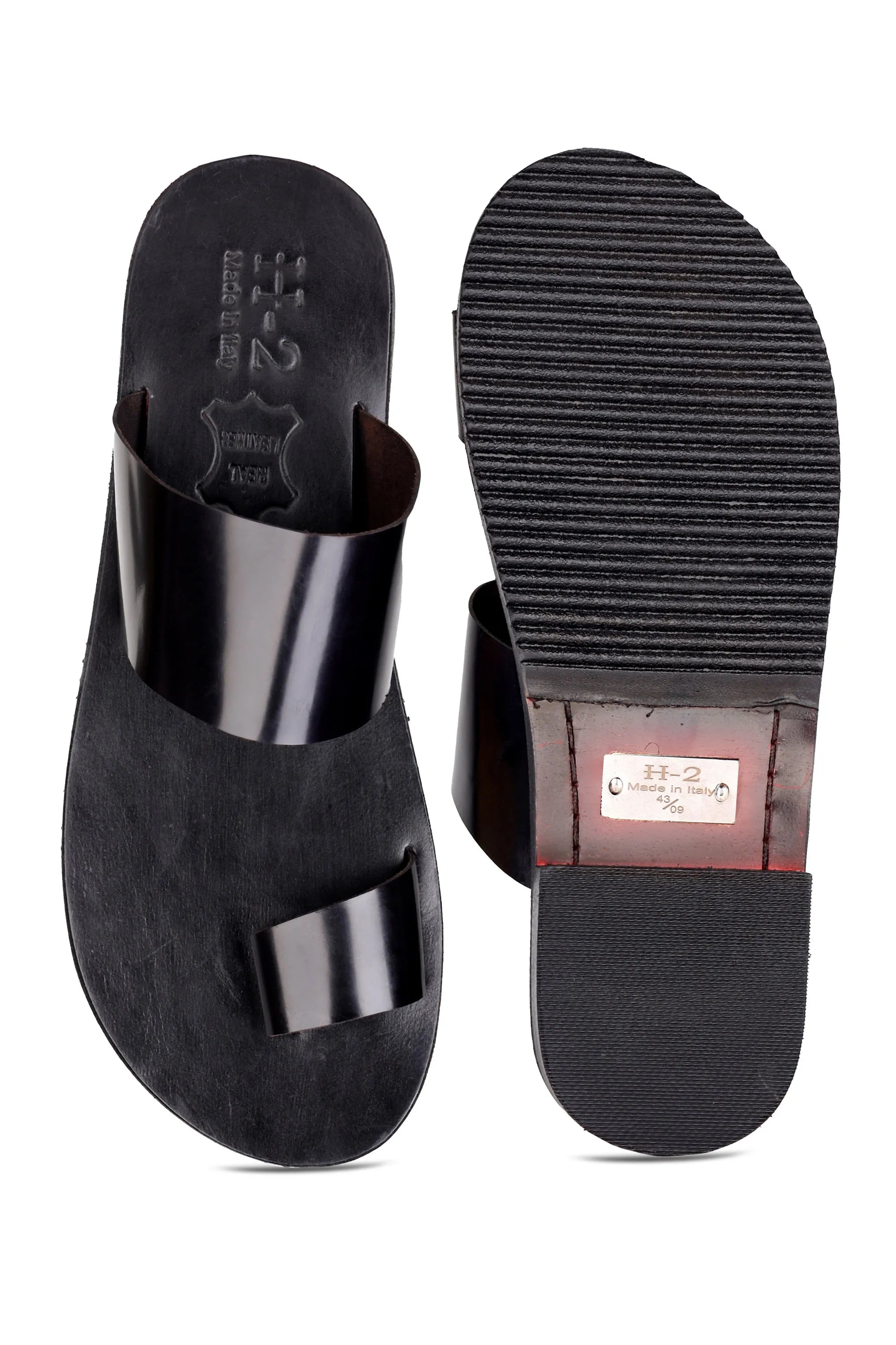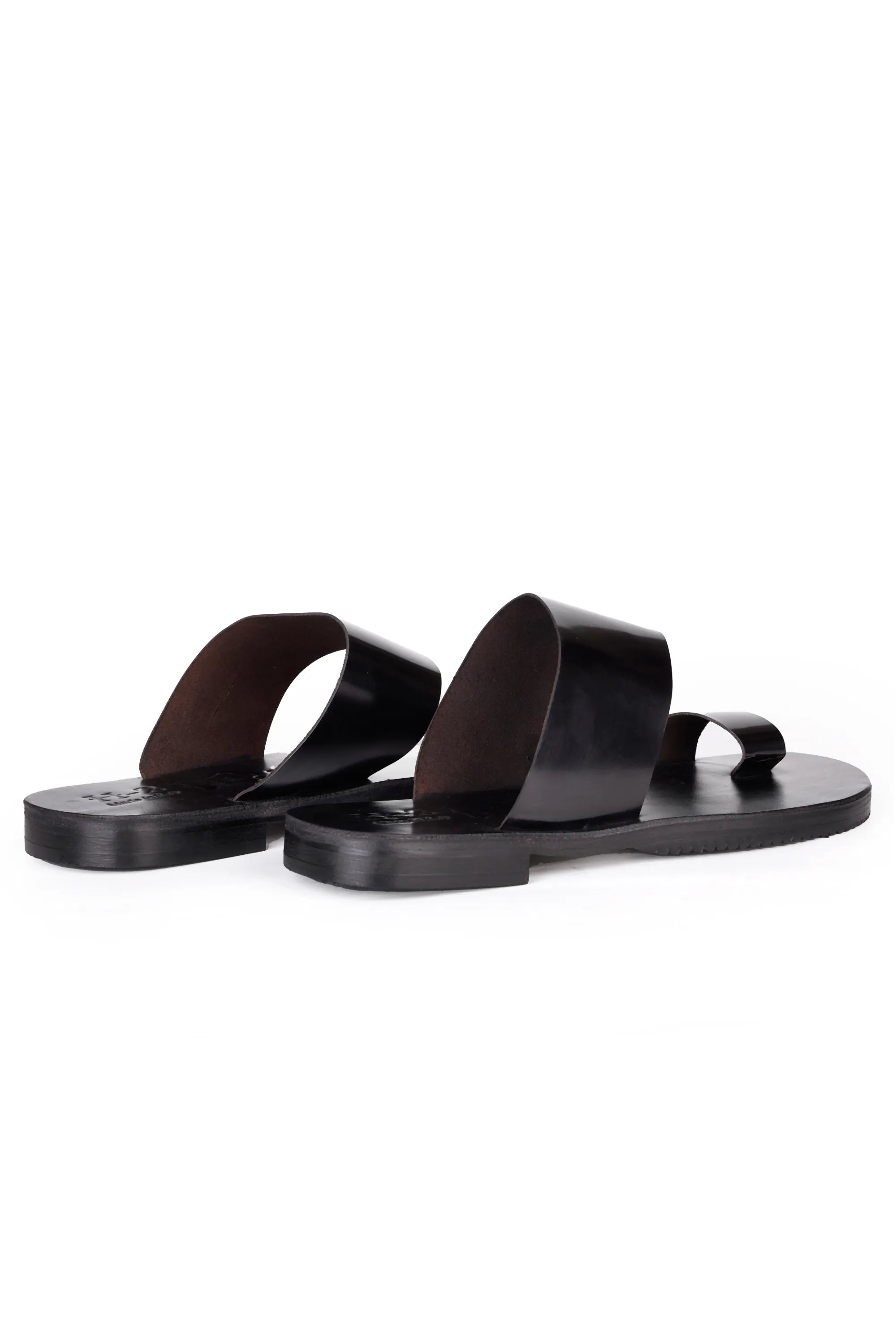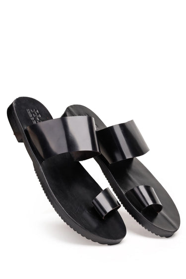 These black pure leather men’s slippers feature a sleek glossy strap paired with a soft leather footbed for all-day comfort. Designed without a heel, they offer a clean, minimal, and modern look perfect for daily wear or casual outings.