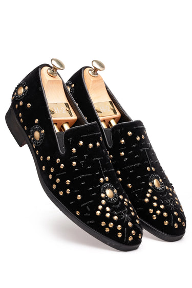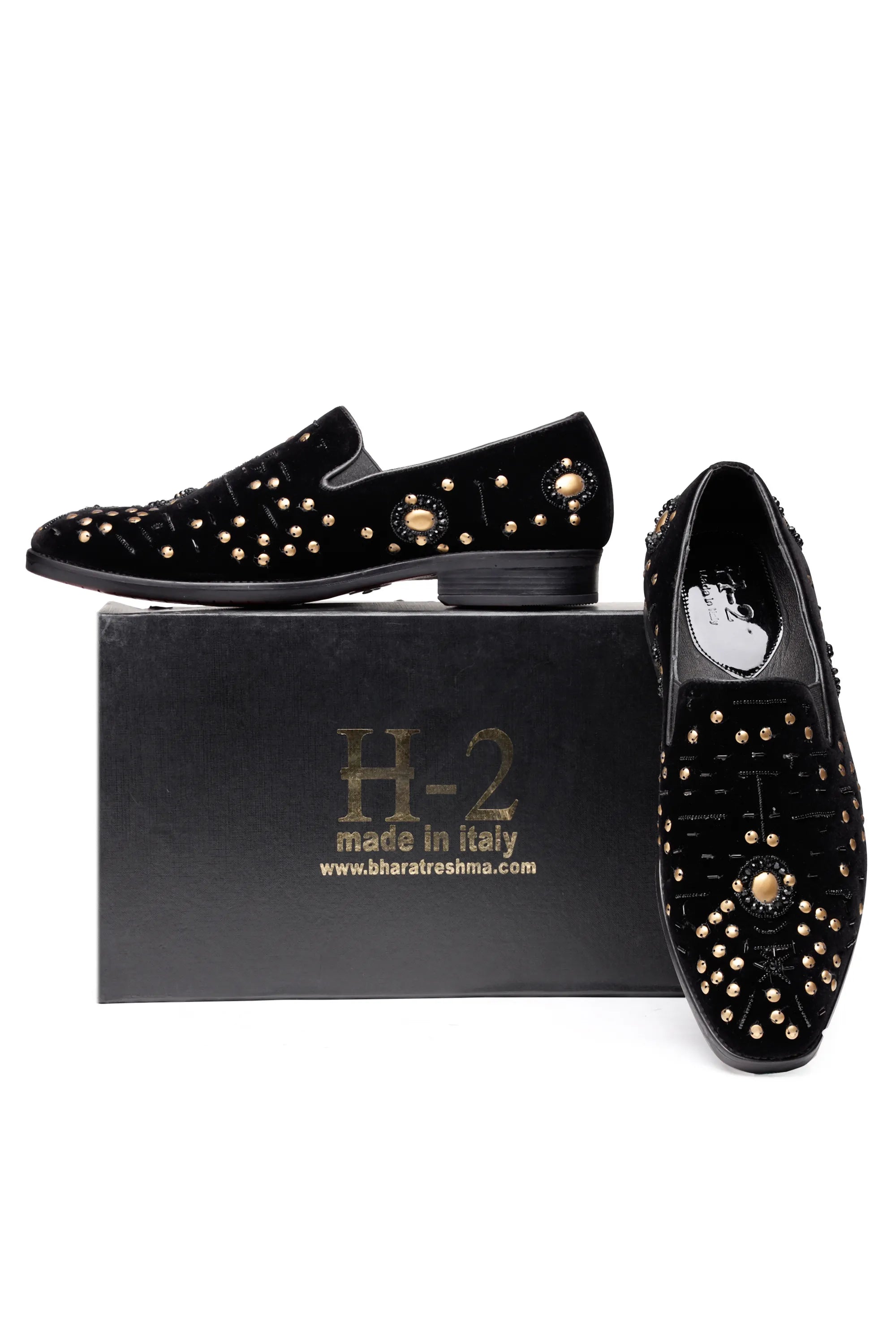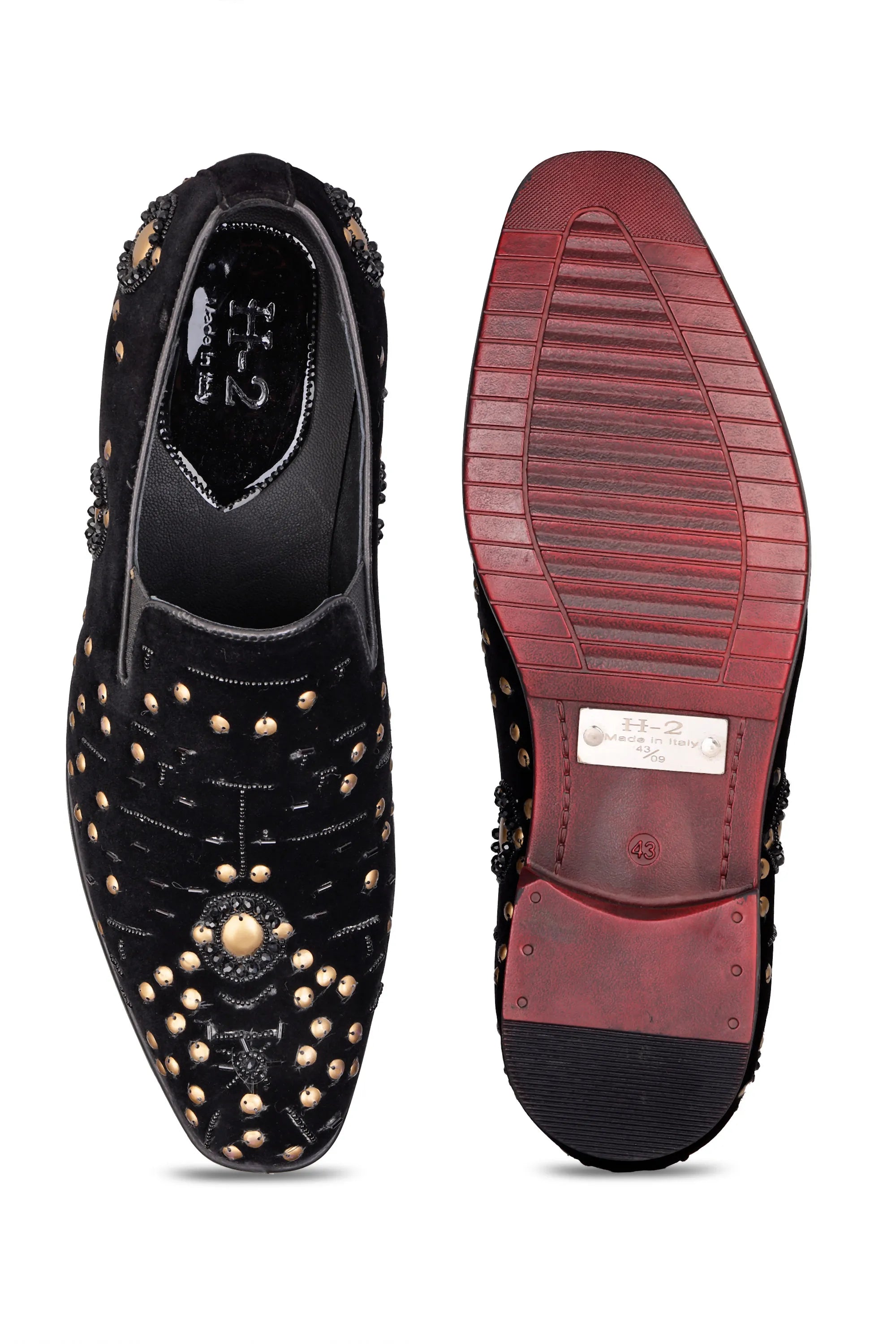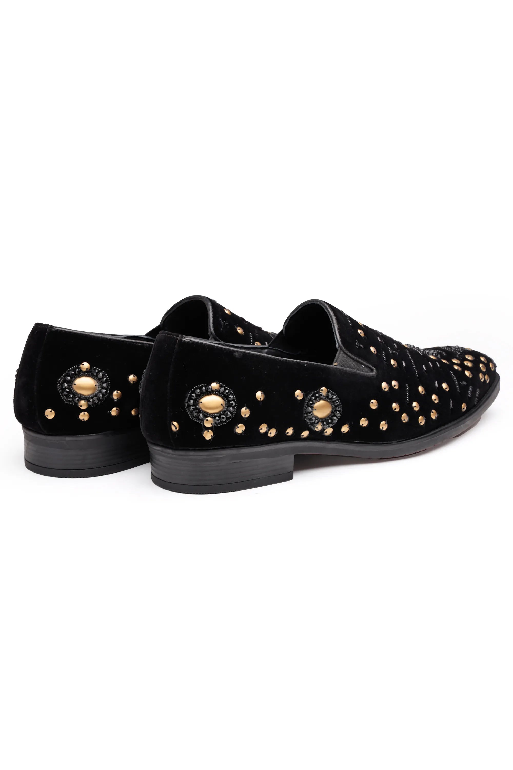 Black Velvet Loafers with Golden Studs & Moti Embellishments