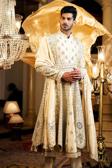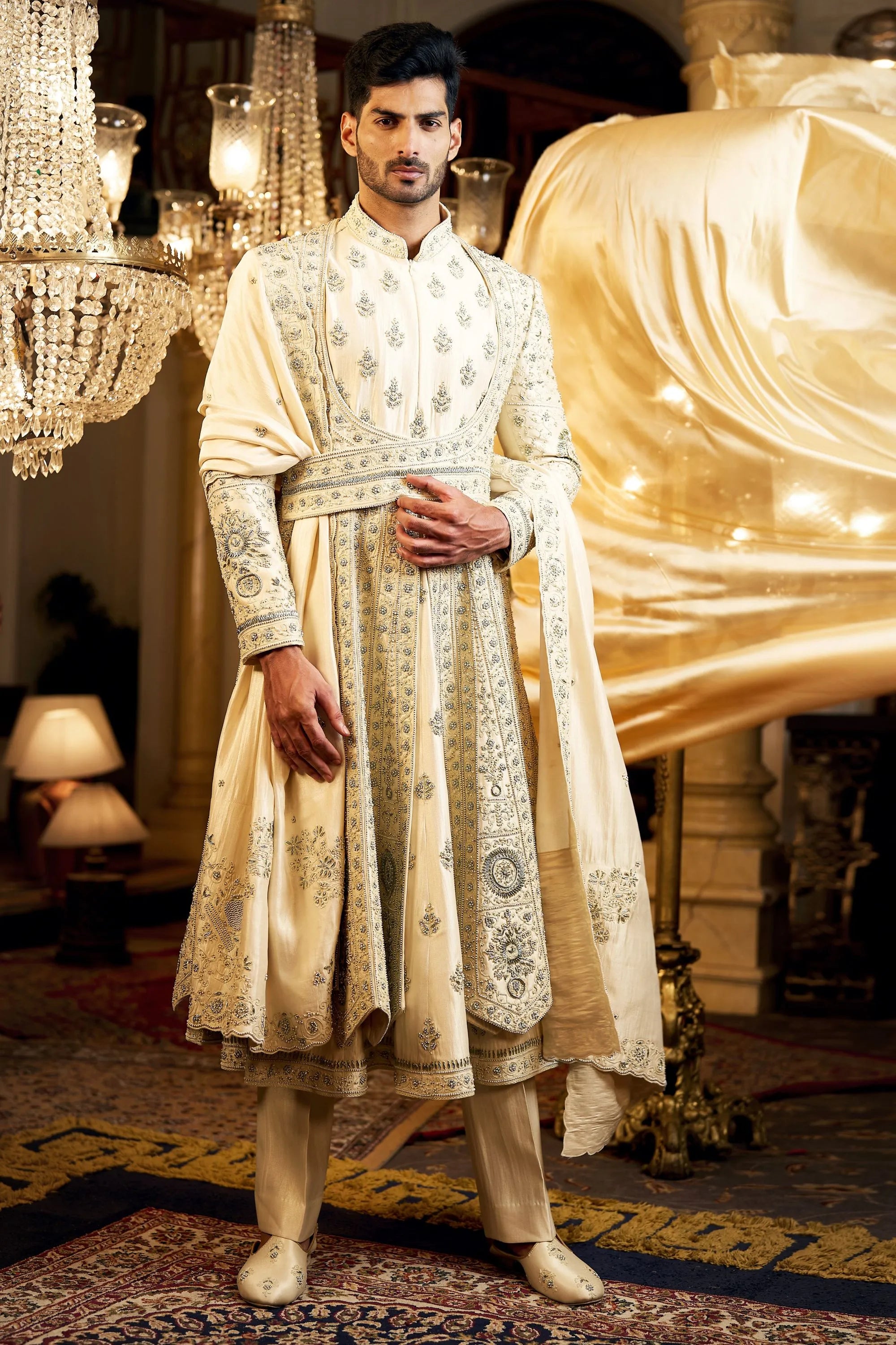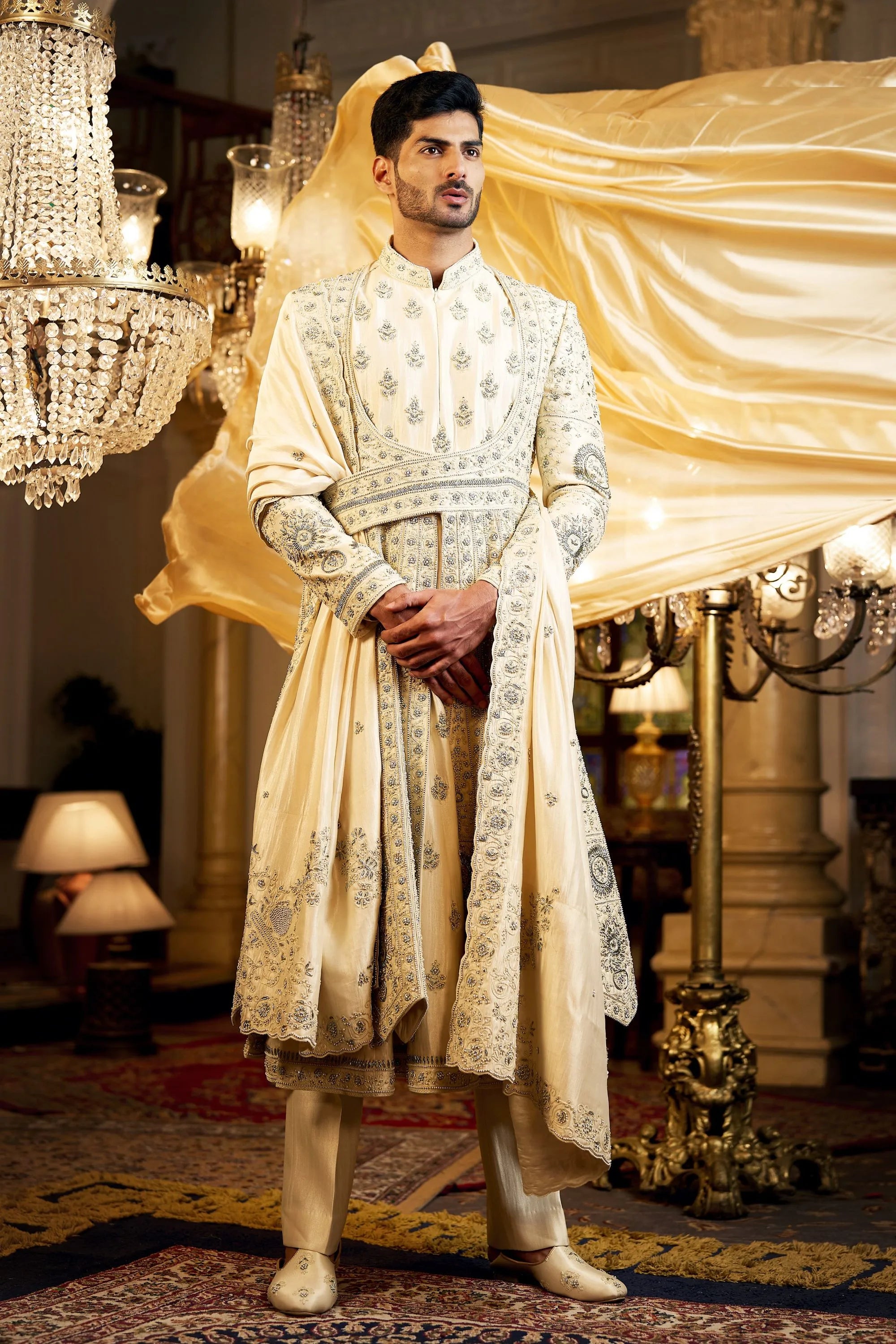 Crafted in luxurious raw silk, this crème Kali sherwani features intricate cutwork, dori detailing, and refined hand embroidery in subtle grey tones—designed purely for royals. Paired with an embroidered stole, motif-butti kurta, churidar, jutti, and belt, it forms a complete opulent ensemble perfect for grand celebrations.