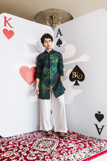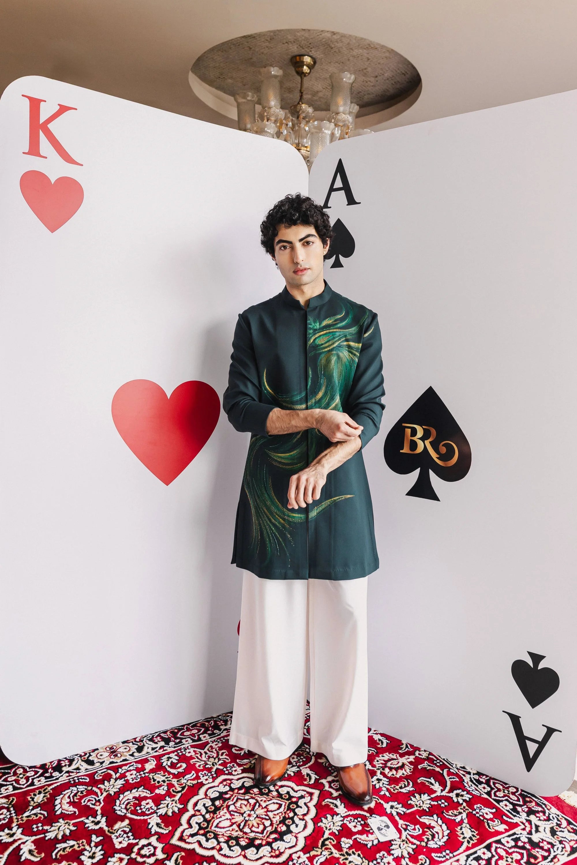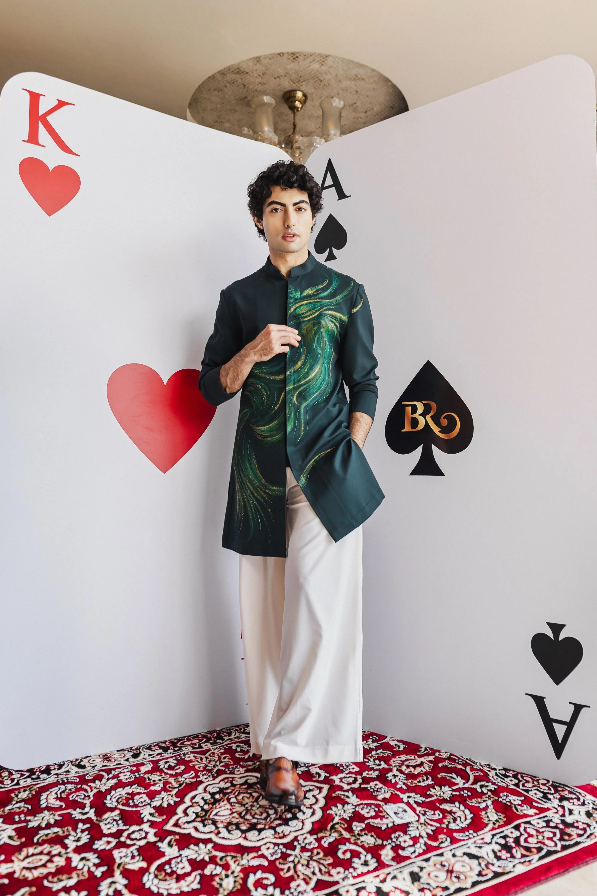 Step into festive elegance with the Emerald Canvas bottle green kurta. Designed with a unique front-open silhouette, this kurta features artistic hand-painted strokes and delicate hand embroidery, adding a subtle festive bling. Pair it with churidar or tailored trousers for a bold yet refined ethnic look, perfect for weddings, Diwali celebrations, and special occasions.