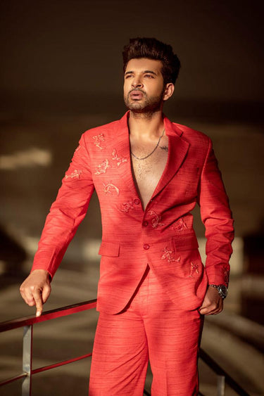Karan Kundra in Our Red All Season Slim-fit Blazer and Pant Set - Bharat Reshma