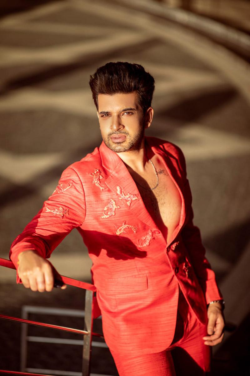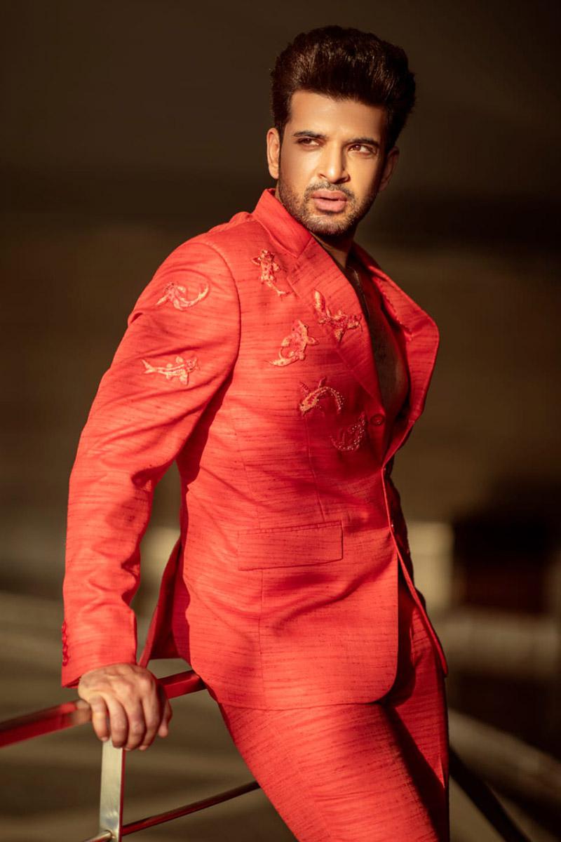 Karan Kundra looks dashing in designer red all-season slim-fit blazer and pant set by Bharat Reshma - crafted for a sharp, modern look with timeless appeal.