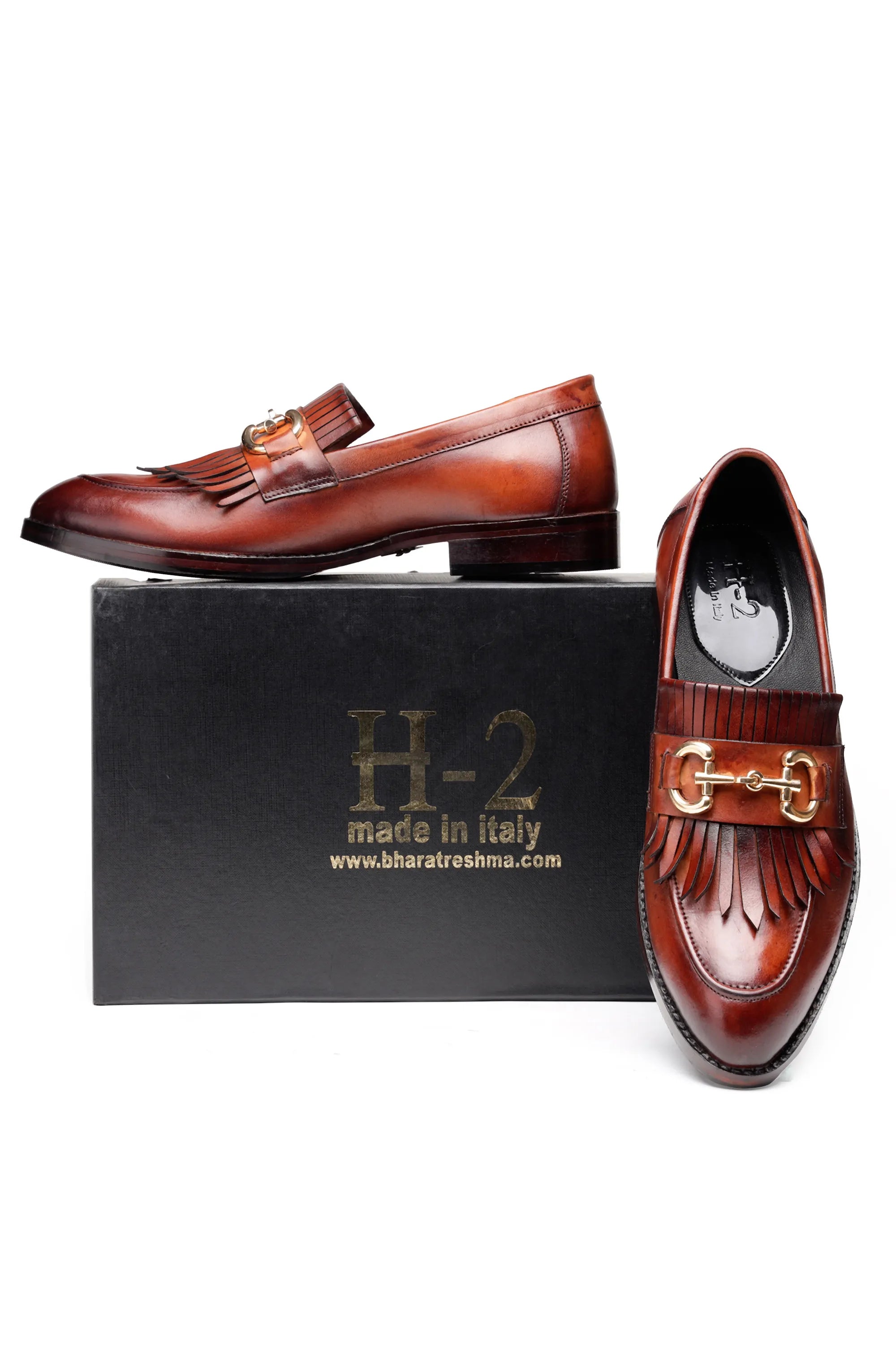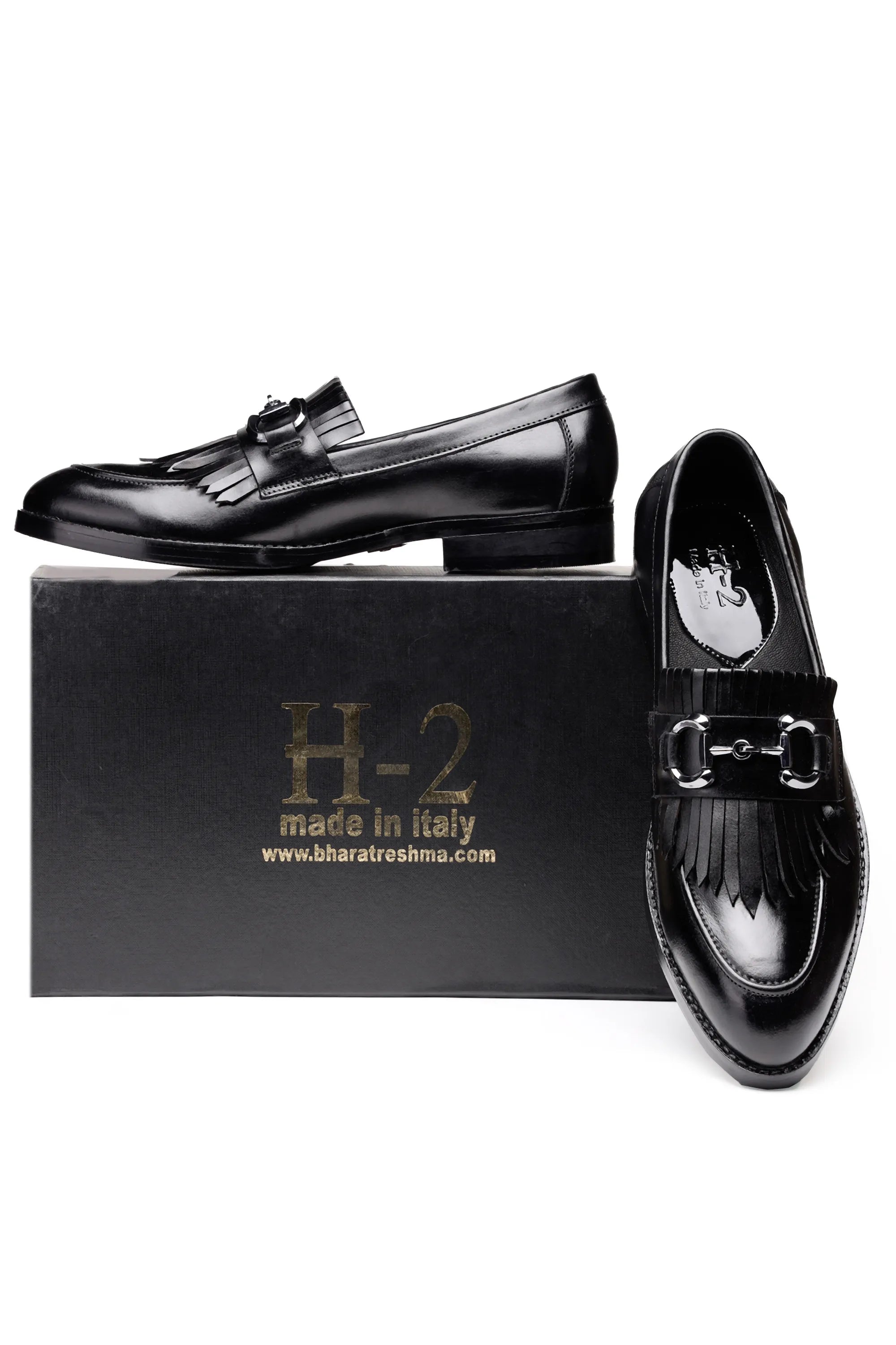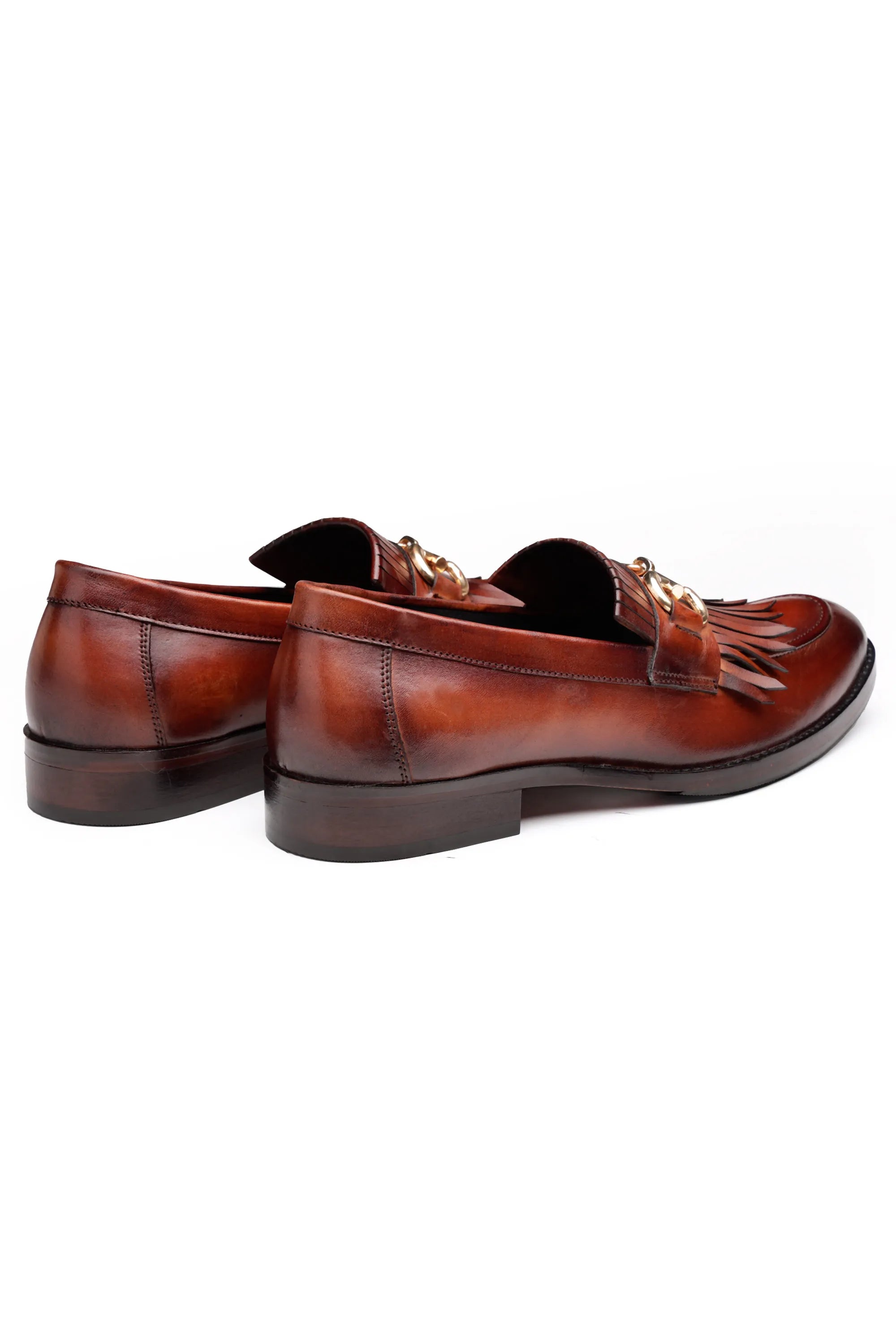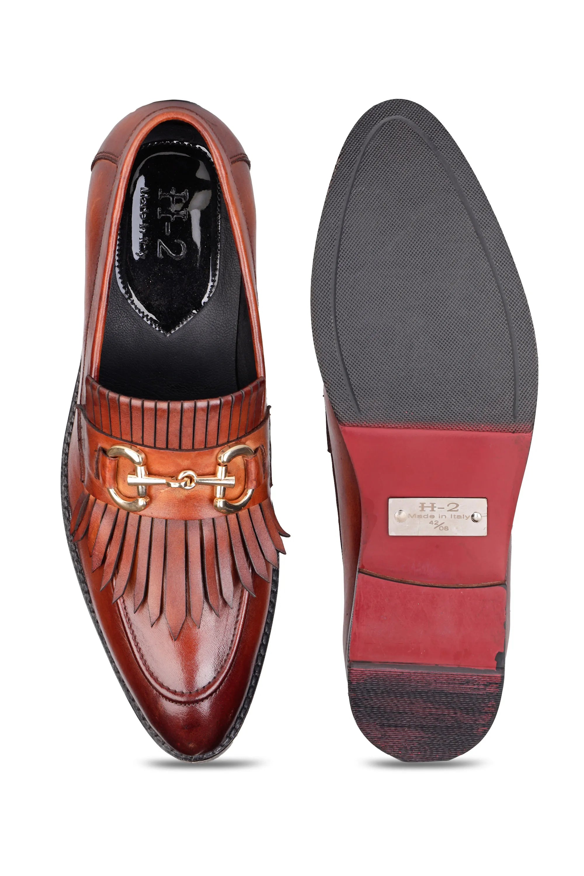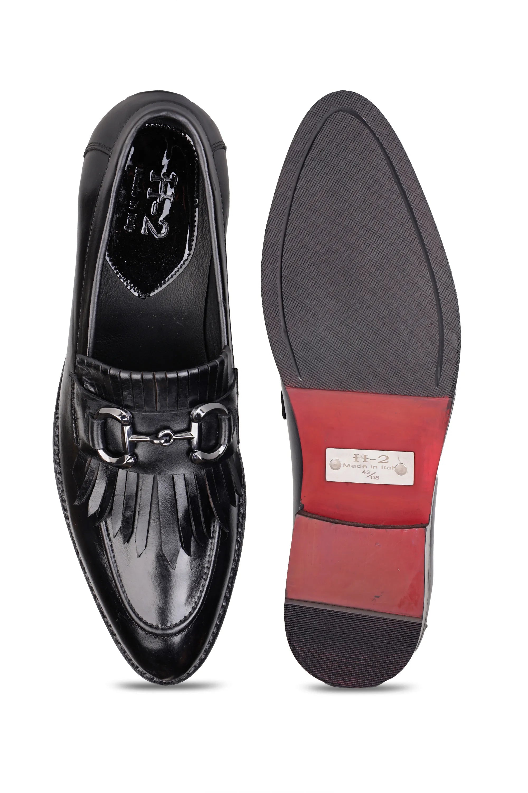 xperience premium craftsmanship with these Leather Horsebit Loafers for Men, available in Black and Brown. Designed with elegant fringe tassel detailing and a signature metal horsebit buckle, this pair blends classic charm with modern luxury. The polished leather finish enhances its bold, refined look, making it an ideal choice for formal, semi-formal, festive, and party wear.