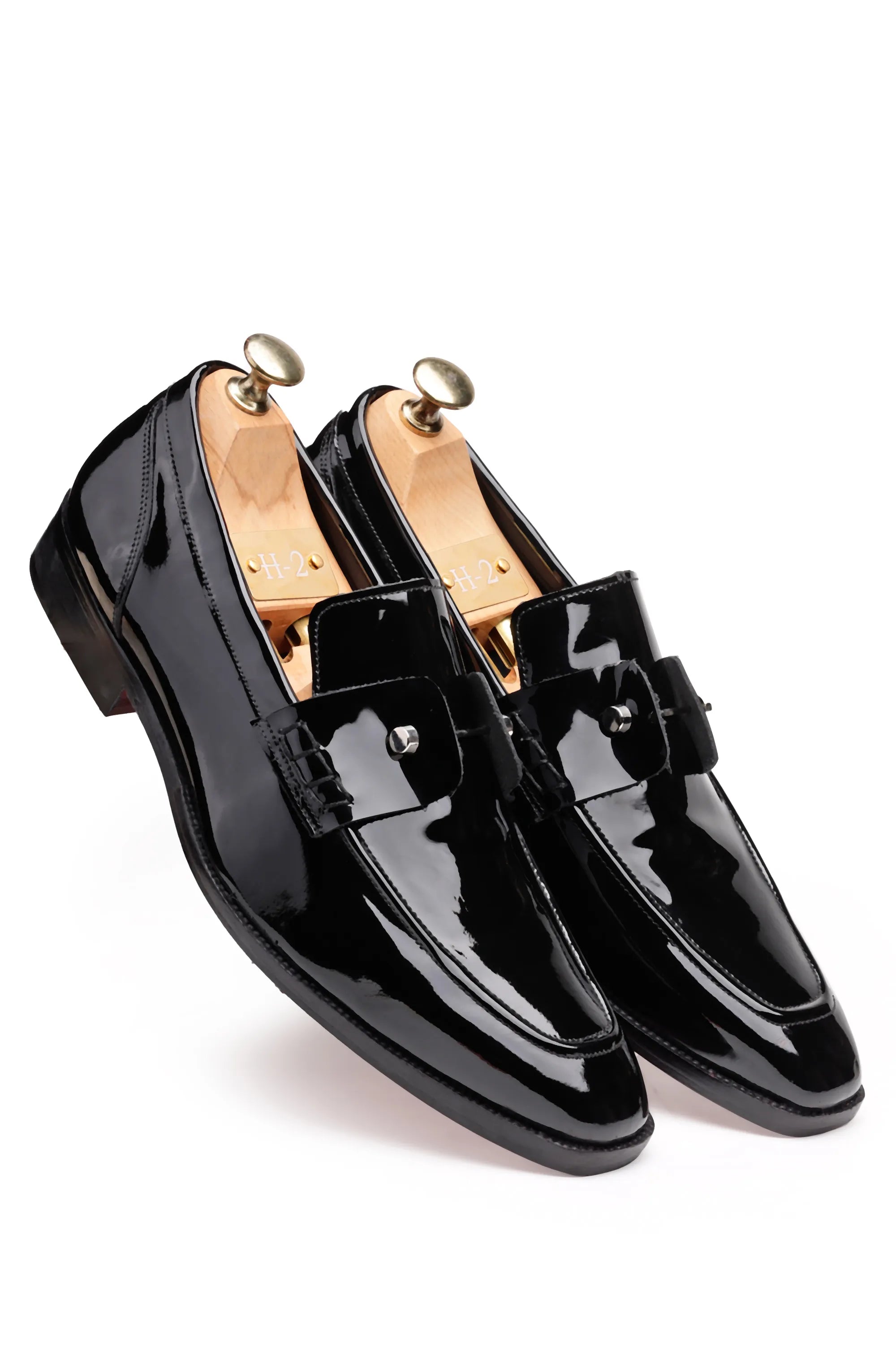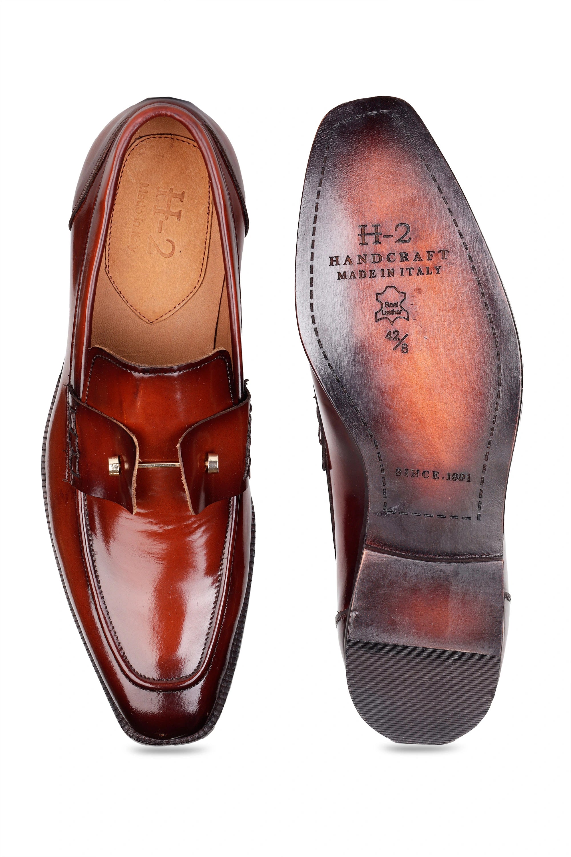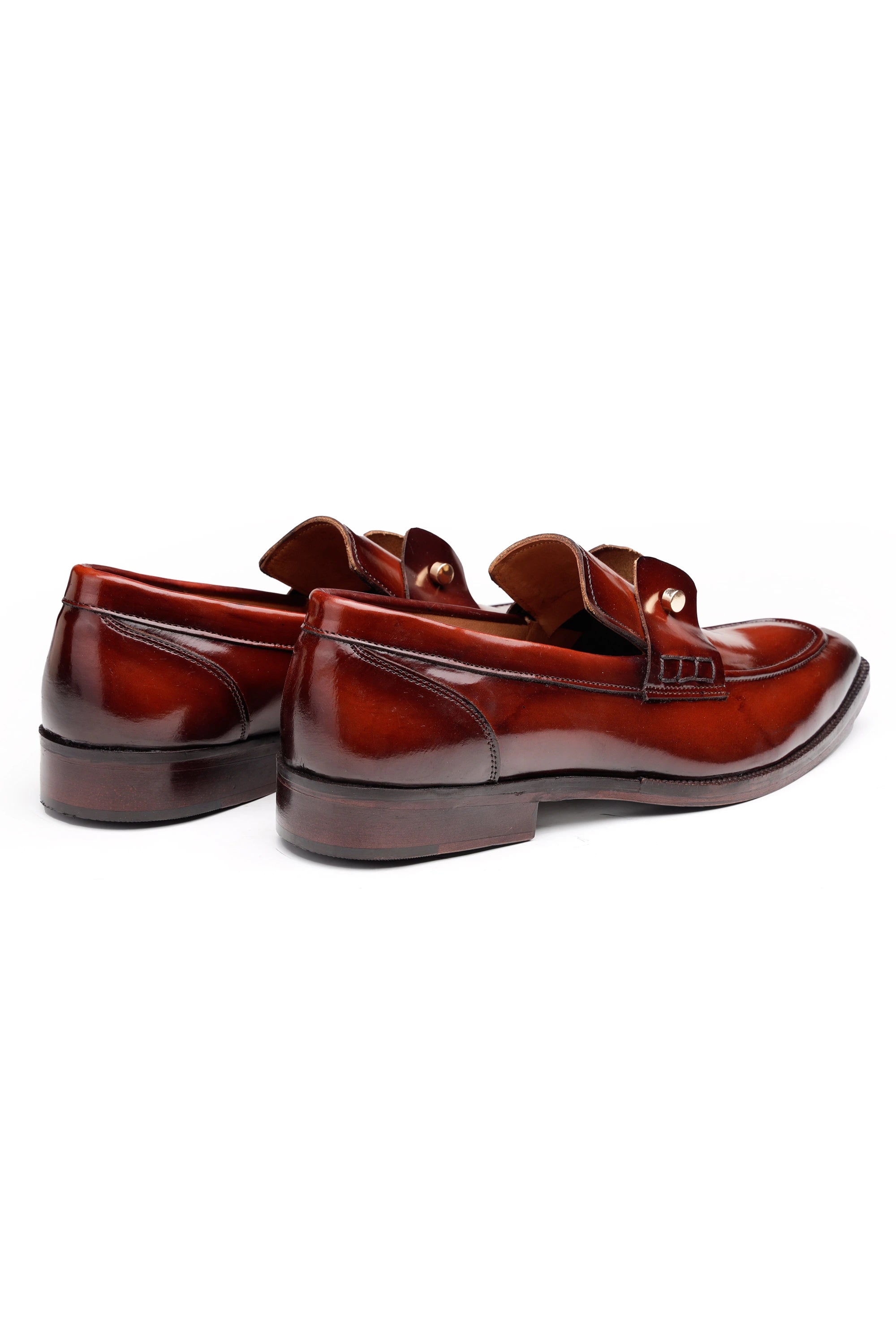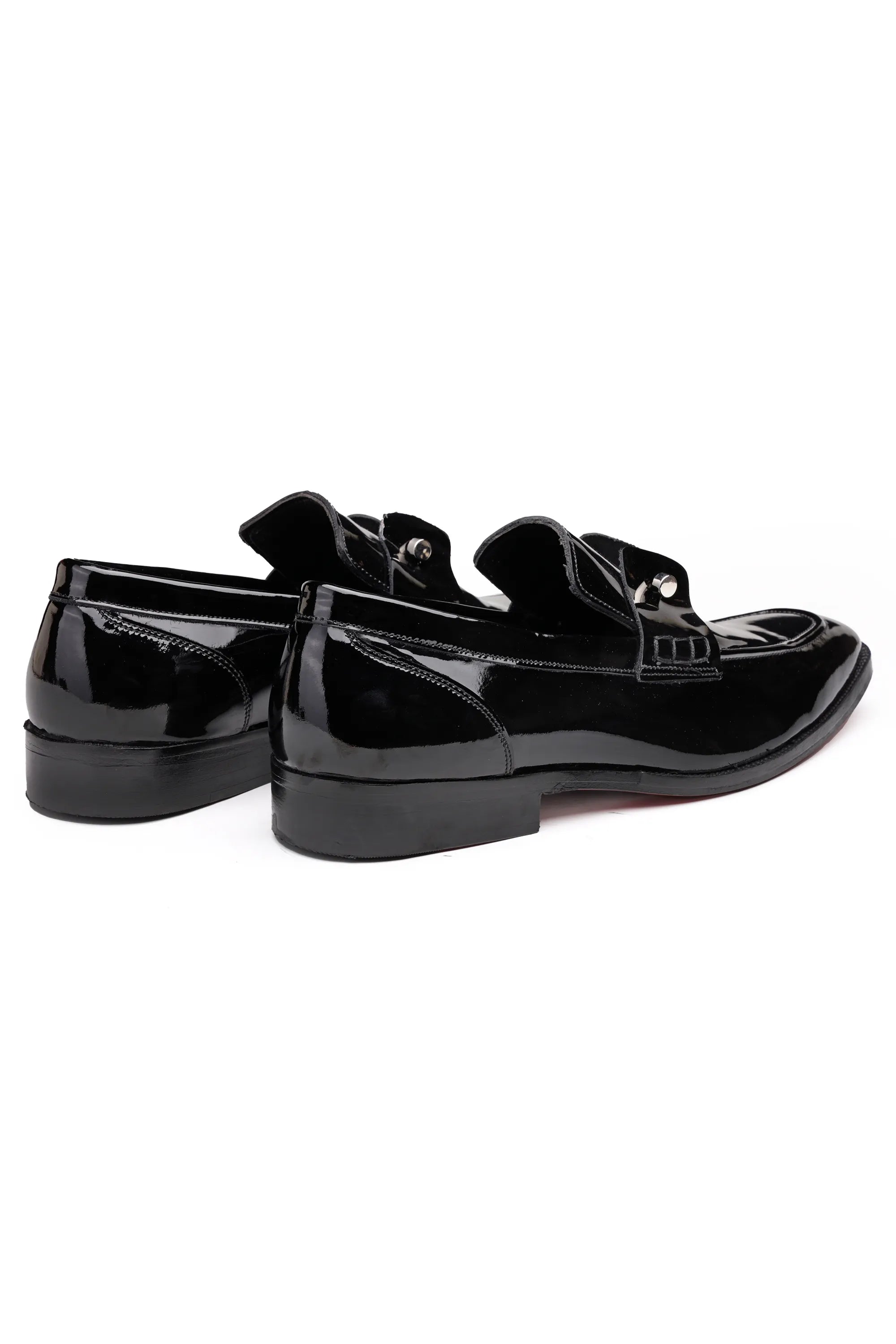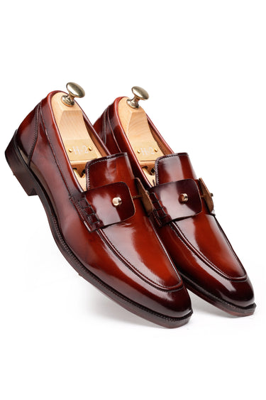 Experience elevated craftsmanship with these premium leather loafers, available in classic black and rich brown tones. Designed with a refined high-gloss polish and precision detailing, this pair features a signature nut-style metal closure placed over the central strap — combining luxury design with practical fastening.