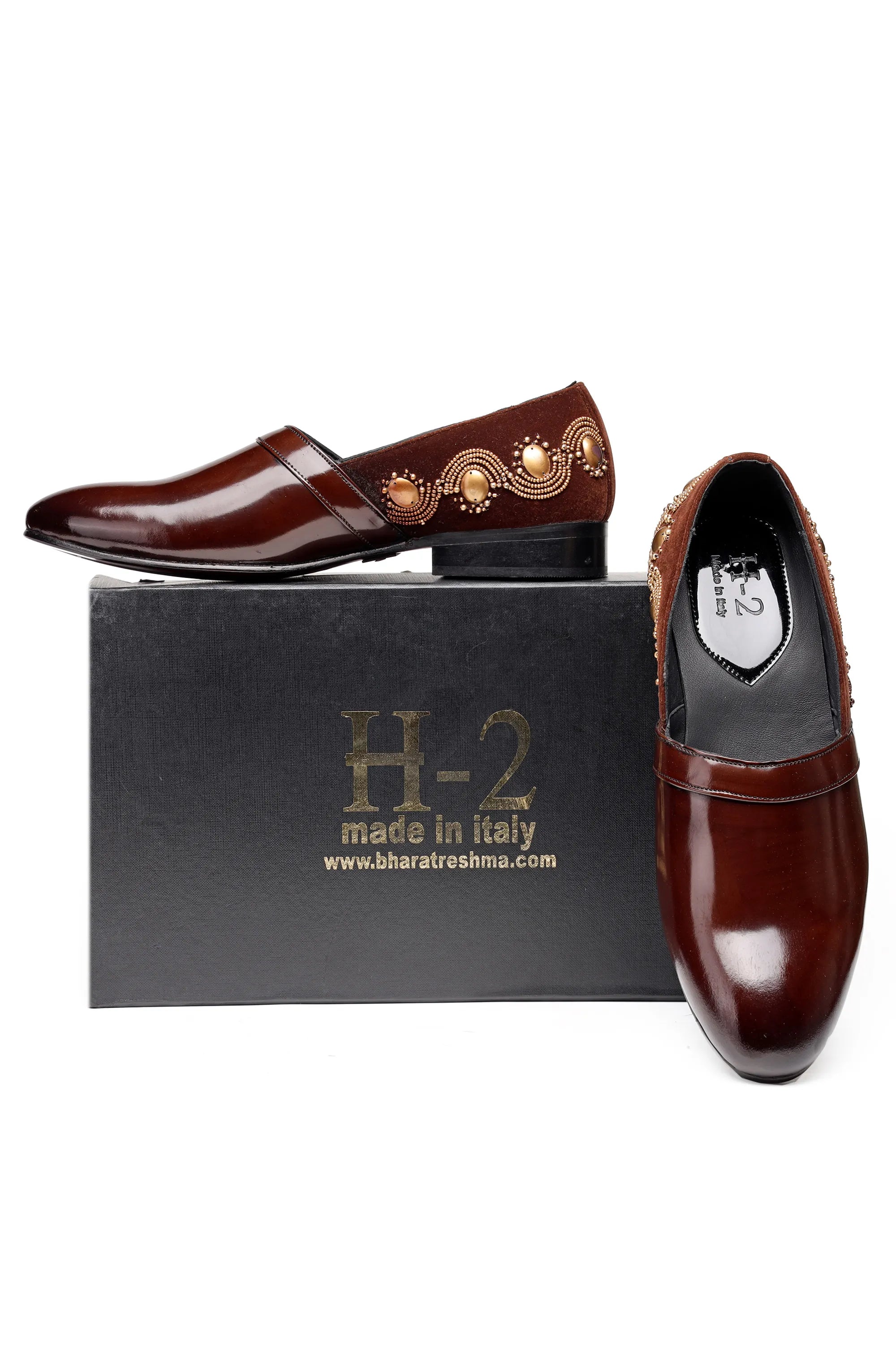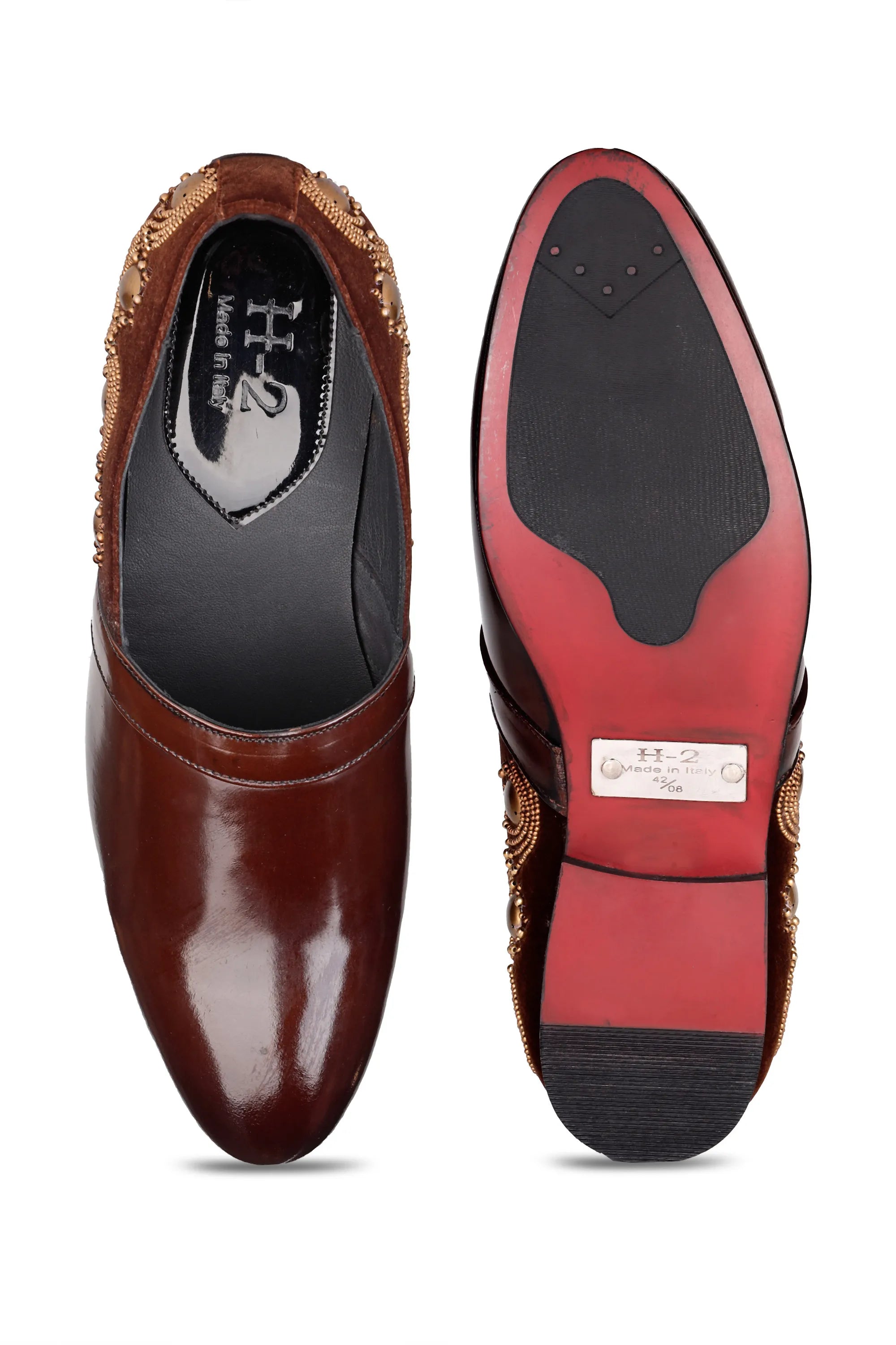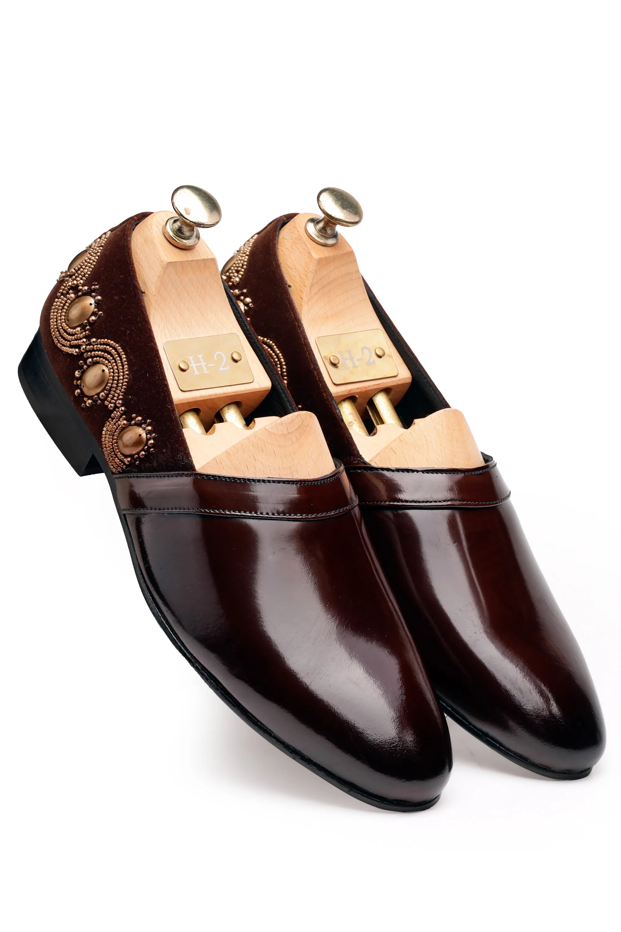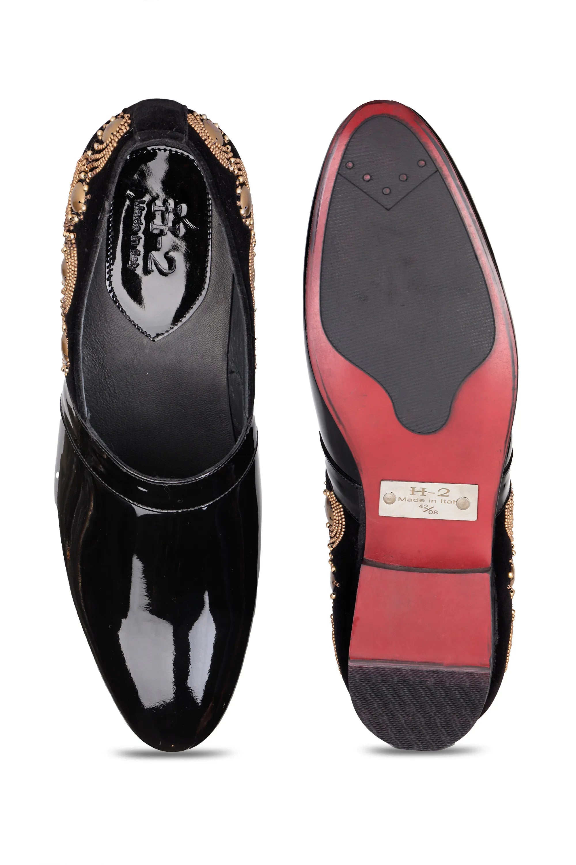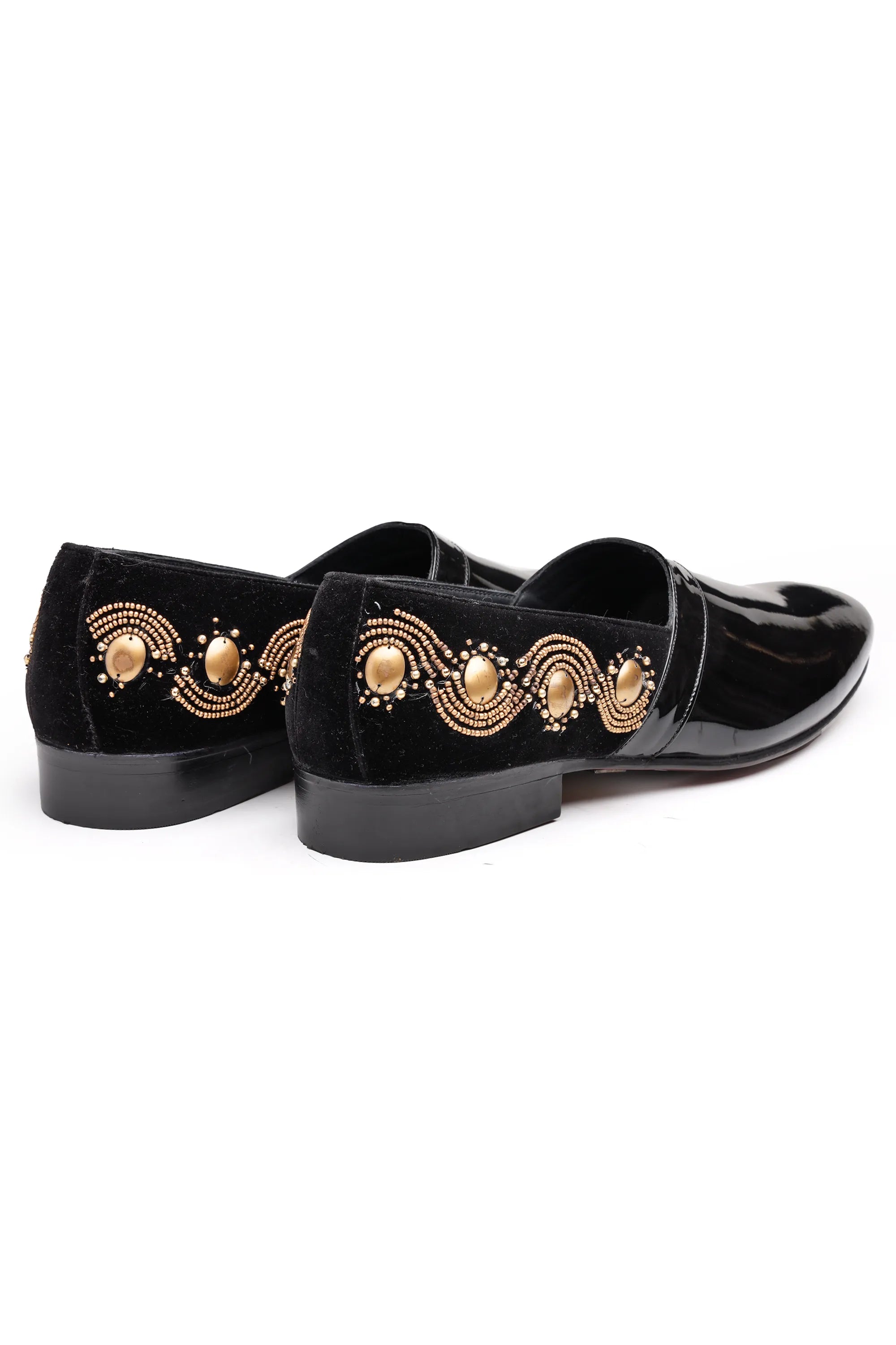 Designed for luxury occasions, these Patent Leather Loafers — available in Black and Brown — offer a striking blend of high-gloss leather at the front and rich velvet detailing at the back. The heel section is meticulously hand-embellished with intricate embroidery, gold studs, and pearl accents, creating a regal, spotlight-ready look.