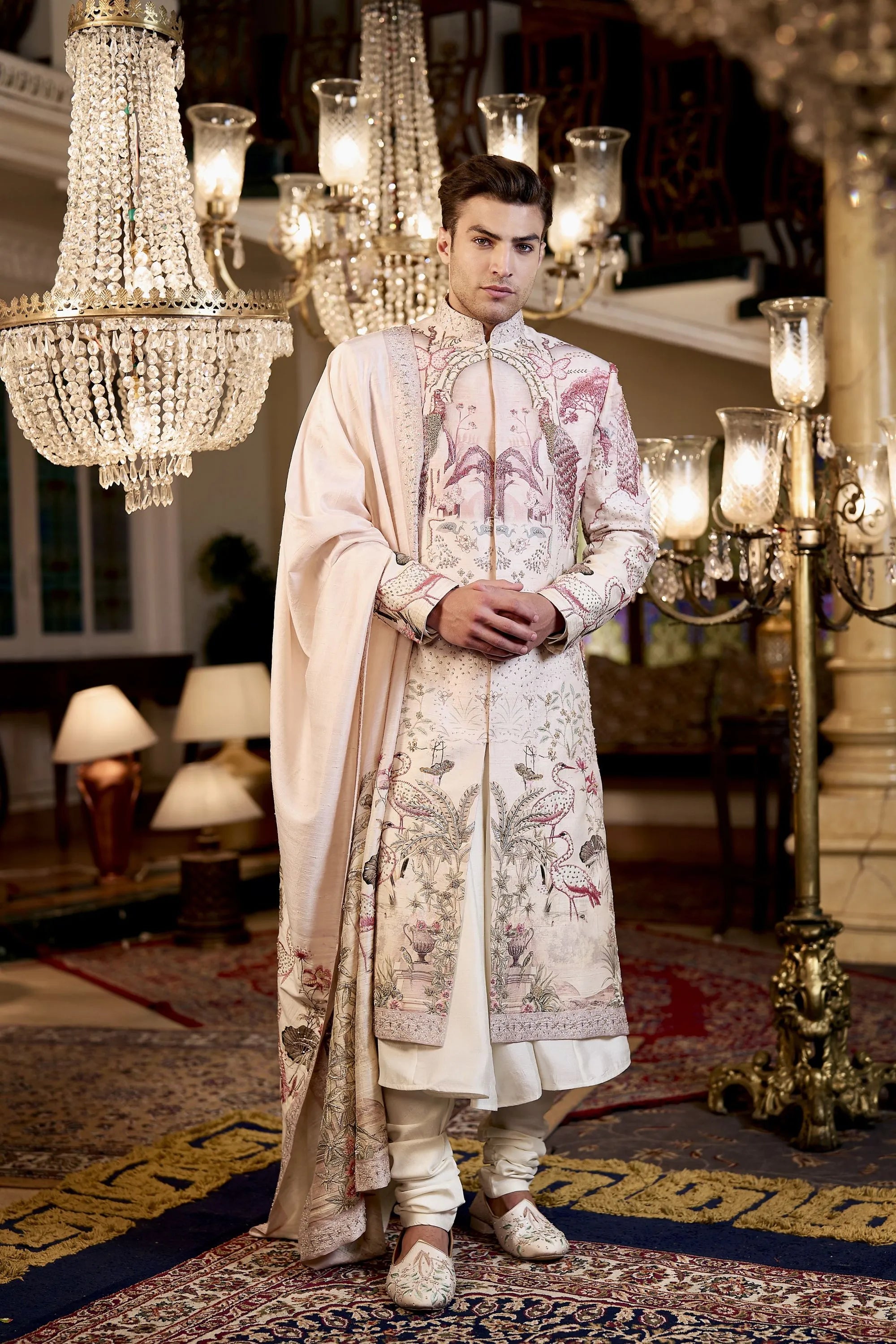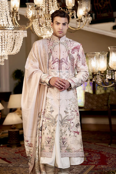 Peach Silk Sherwani with Digital Print & Hand Peacock Zari Work