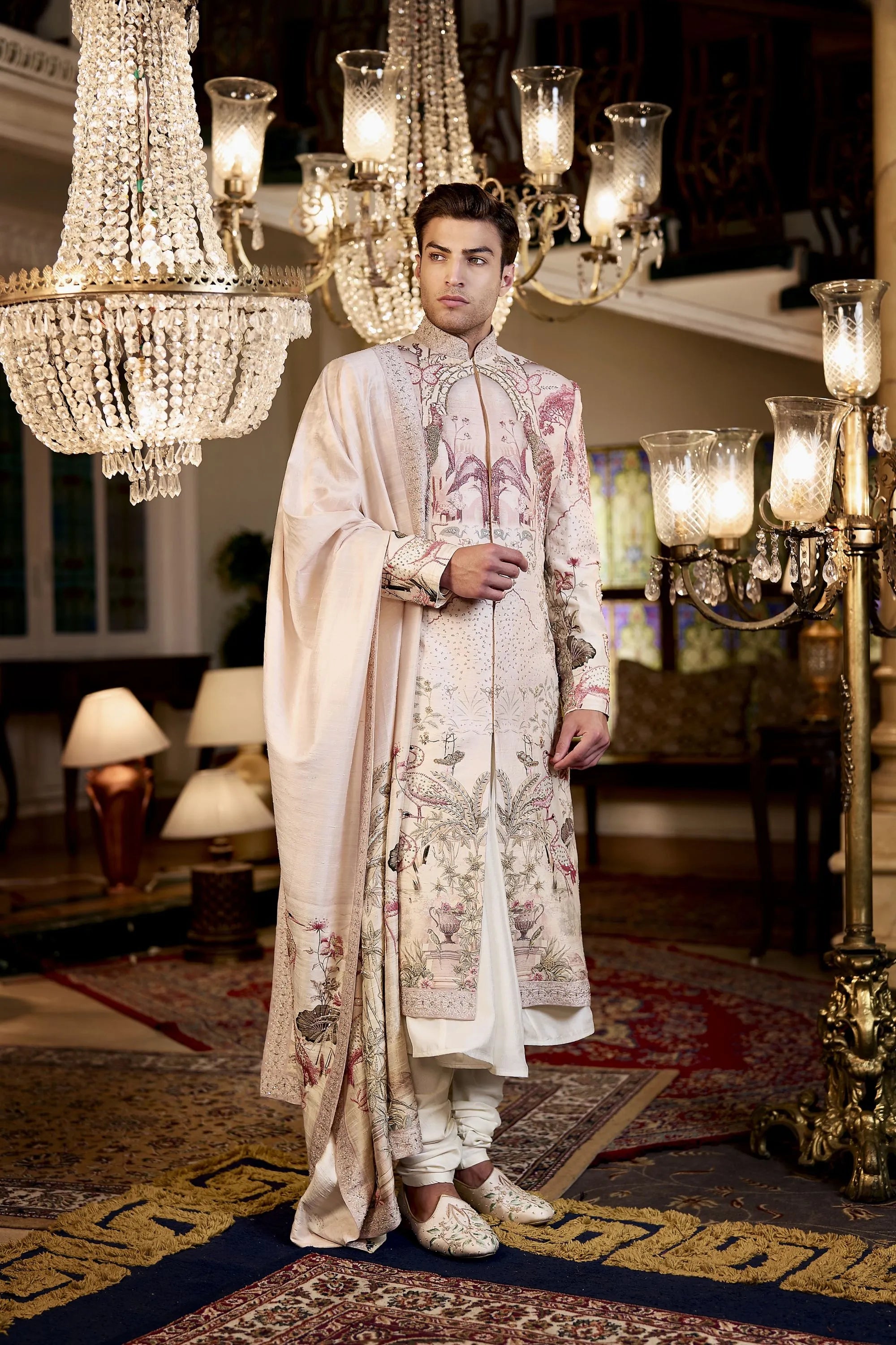 This peach silk sherwani features contemporary digital print detailing enhanced with exquisite, handcrafted embroidery. A majestic peacock motif is highlighted using rich zari, sequin, cutdana and pearl embellishments for an opulent look. Floral and patti handwork across the sherwani adds depth and craftsmanship, making it a regal choice for modern grooms and festive celebrations. Perfect for weddings, receptions or special occasions, this sherwani blends traditional artistry with luxury design aesthetics.