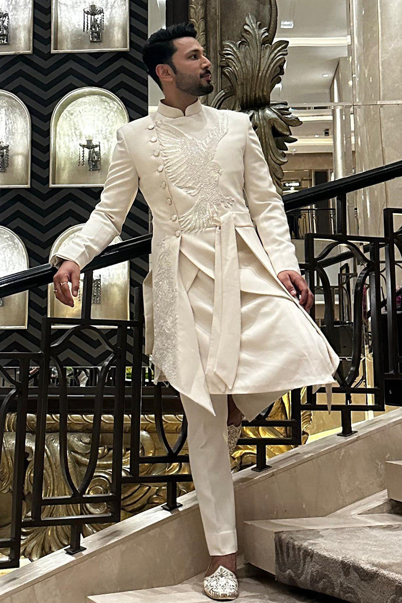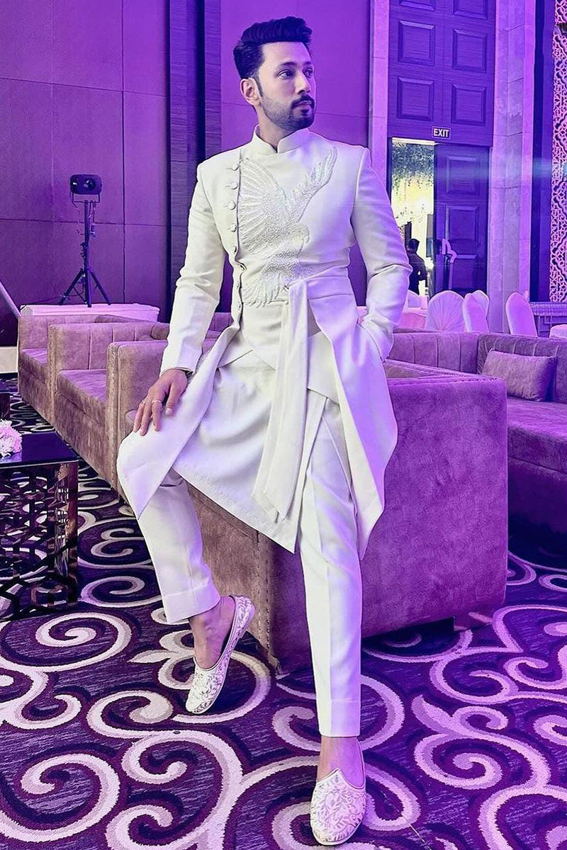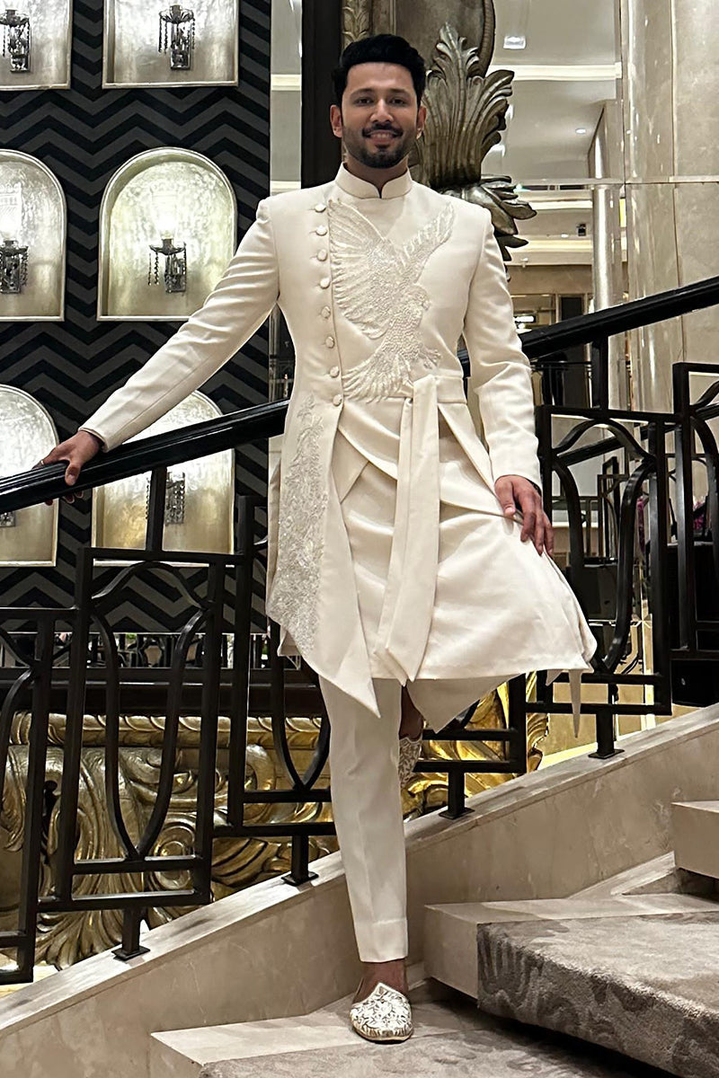 Sahil Anand in White indo western jacket decorated with an eagle pattern