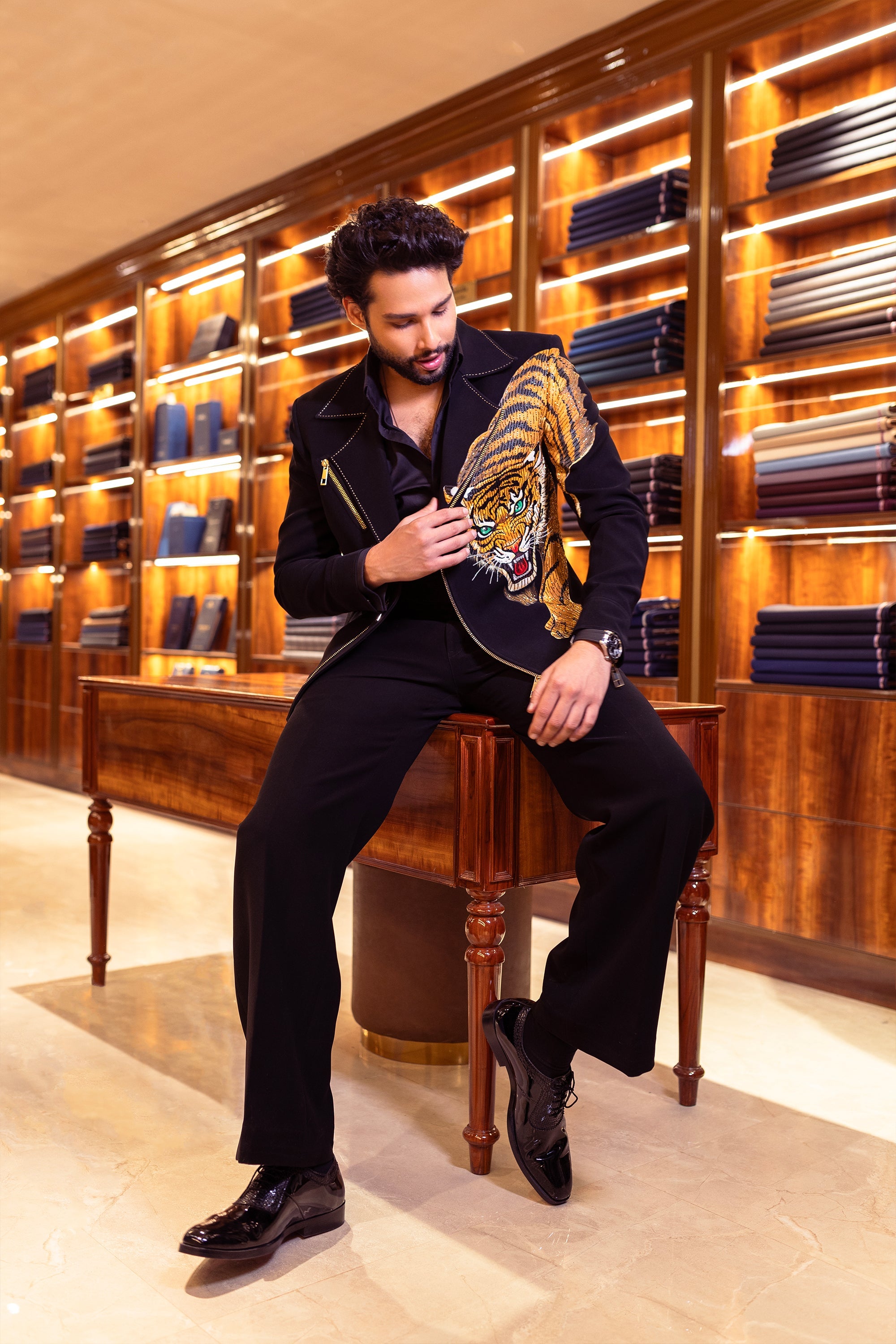 Siddhant Chaturvedi in Our Black Hand Painted with Studs, Pearls Work Lion Design Jacket - Bharat Reshma