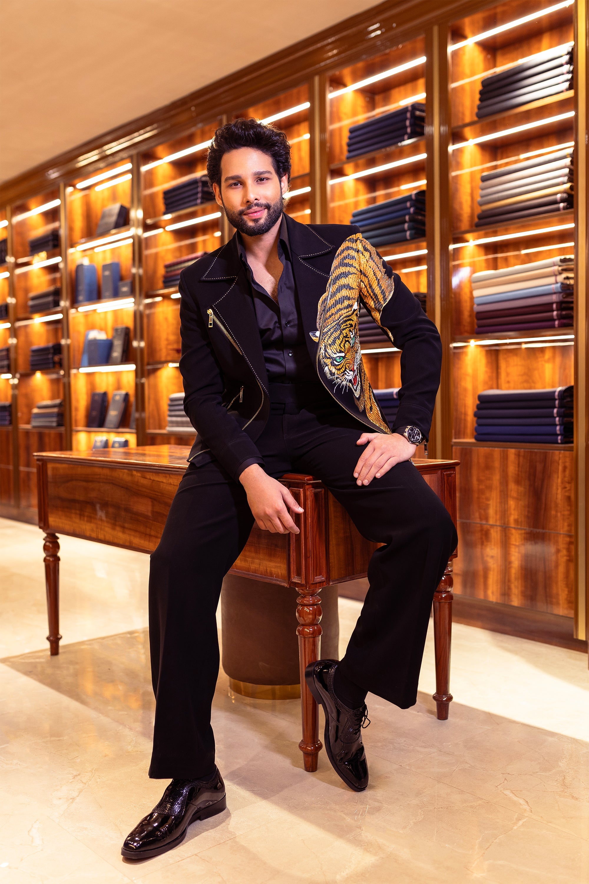 Siddhant Chaturvedi in Our Black Hand Painted with Studs, Pearls Work Lion Design Jacket