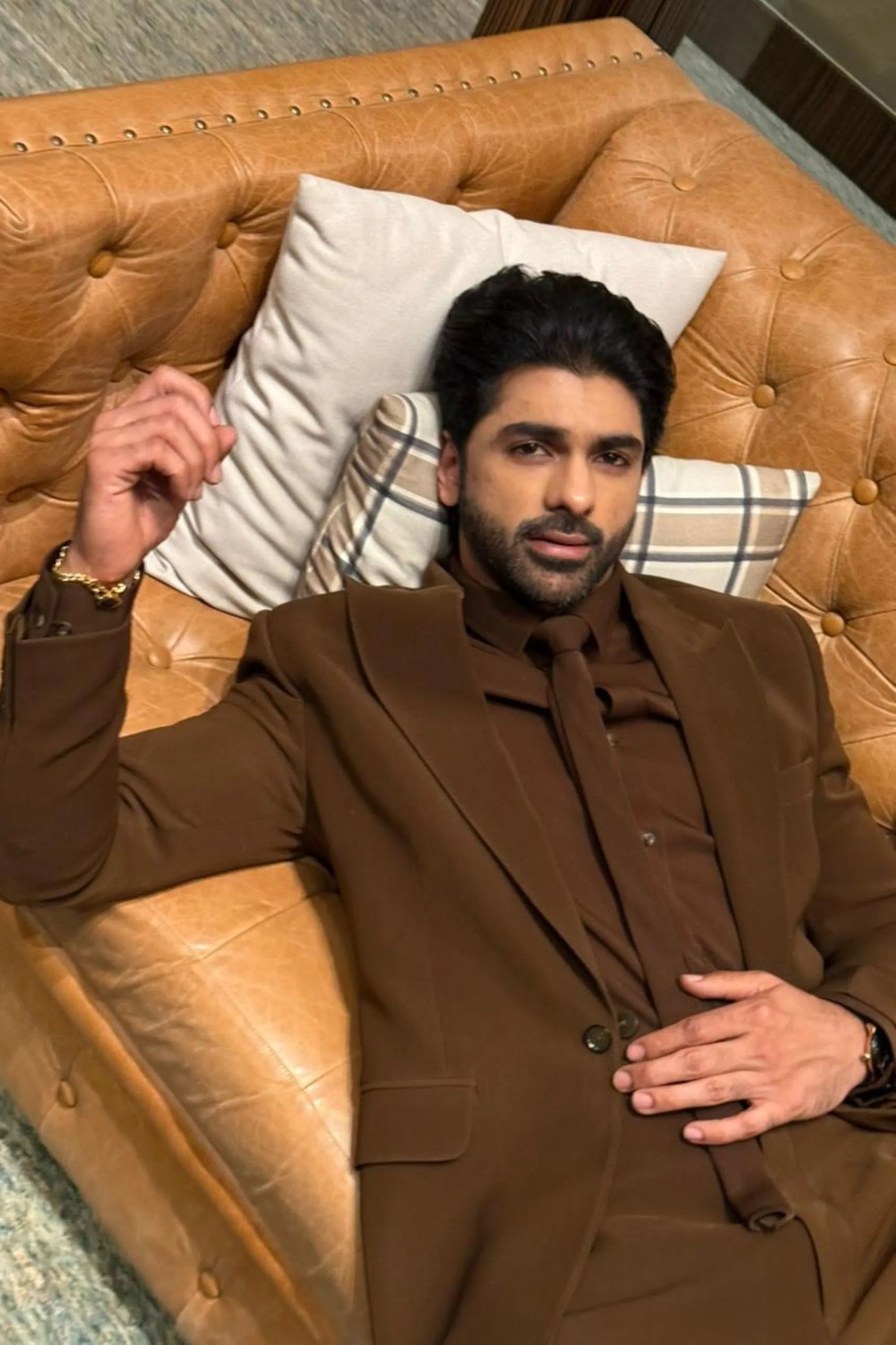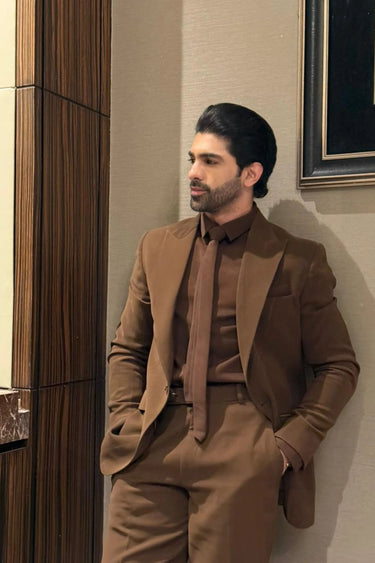 A refined expression of modern elegance, this signature Brown 2-Piece Suit is crafted from premium Meghna fabric and worn by Taha Shah Badussha.