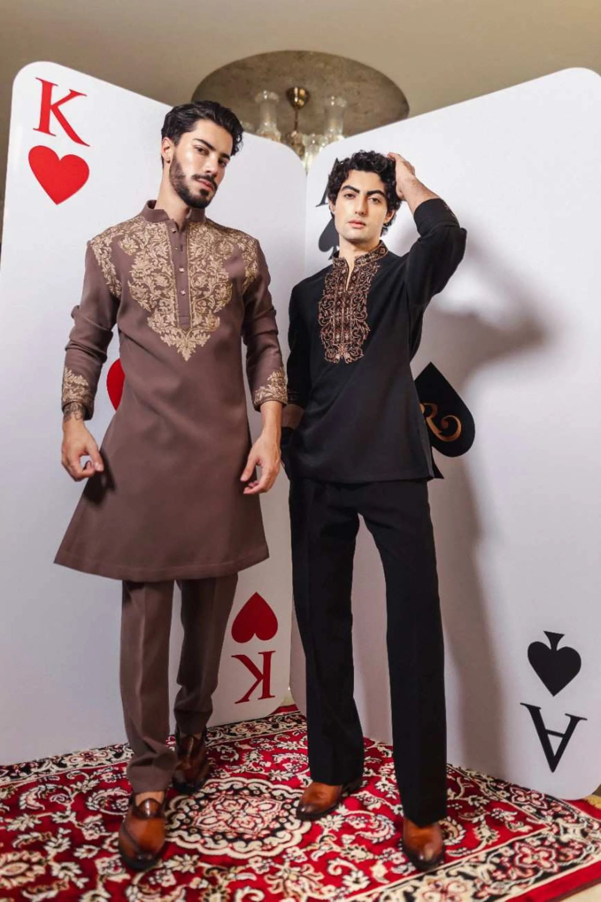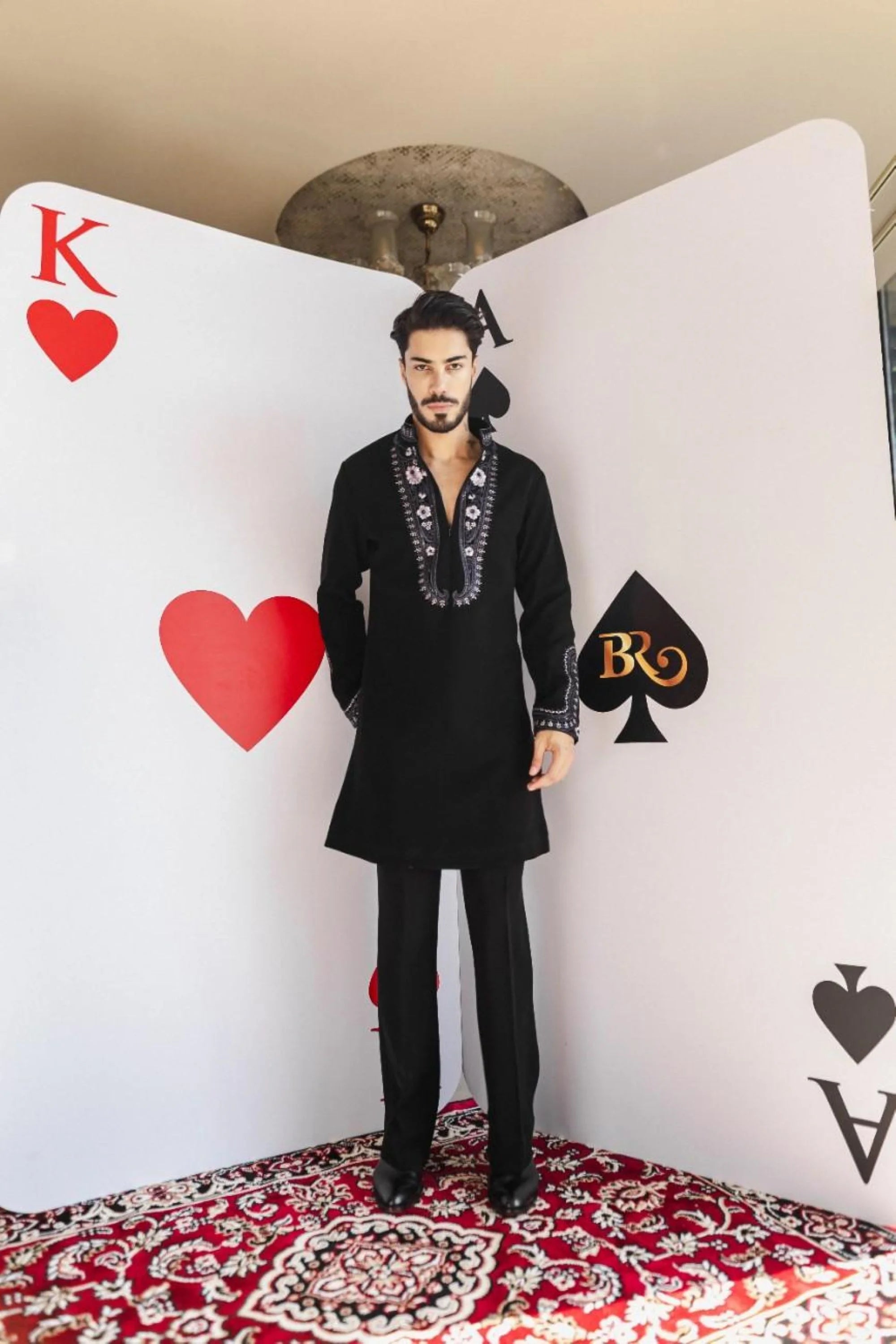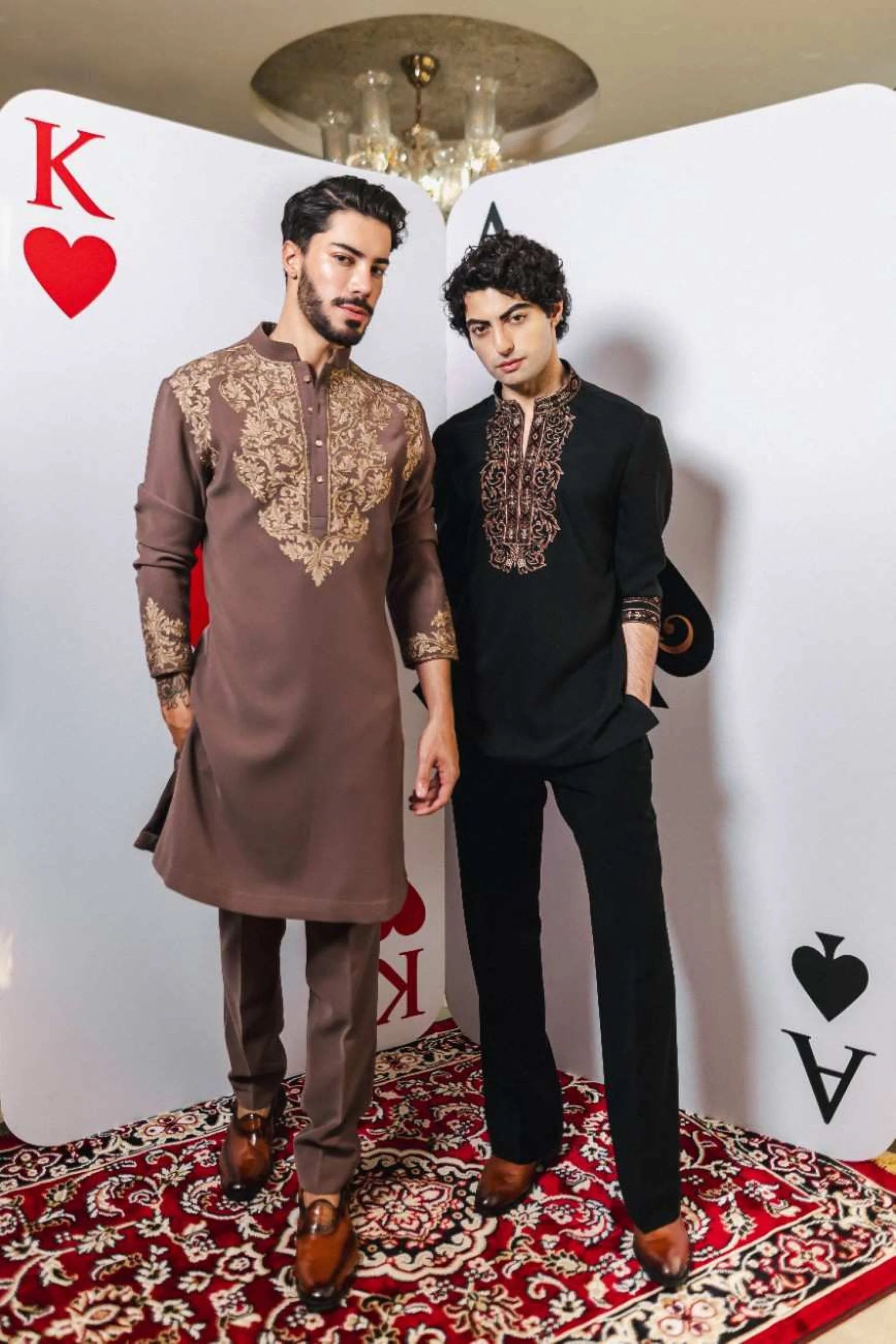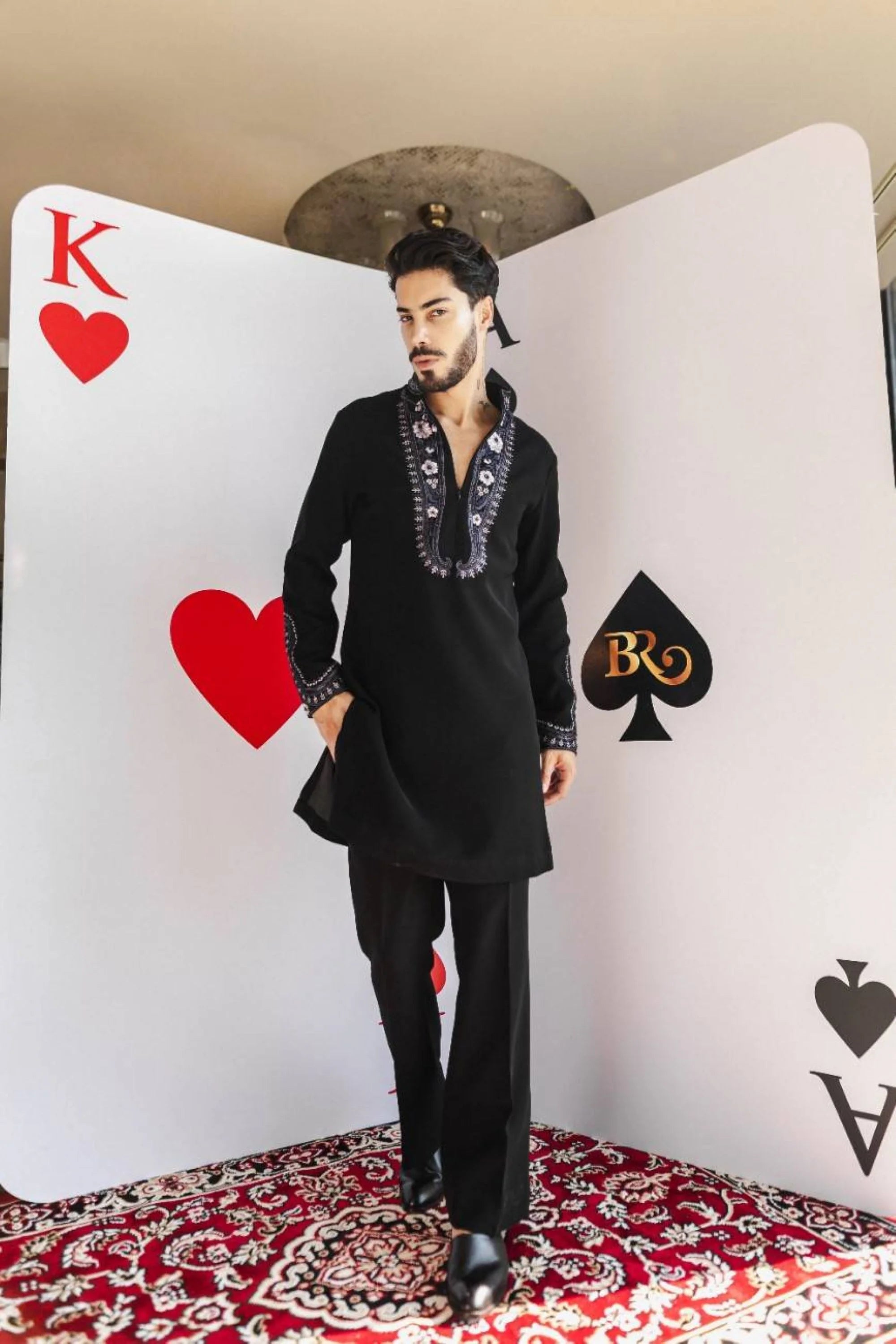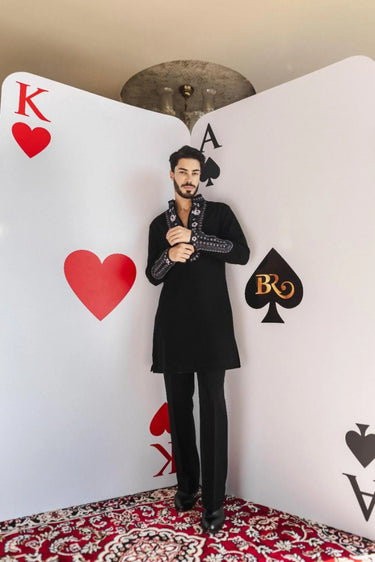 Make a bold festive statement with the Twilight Paisley Kurta Set. This elegant black kurta is highlighted with contrasting purple embroidery in a unique paisley design, crafted to stand out even in dim light. Paired with tonal pants, it creates a striking balance of tradition and modern style. Ideal for Diwali, weddings, and festive evenings, this kurta set ensures effortless sophistication.