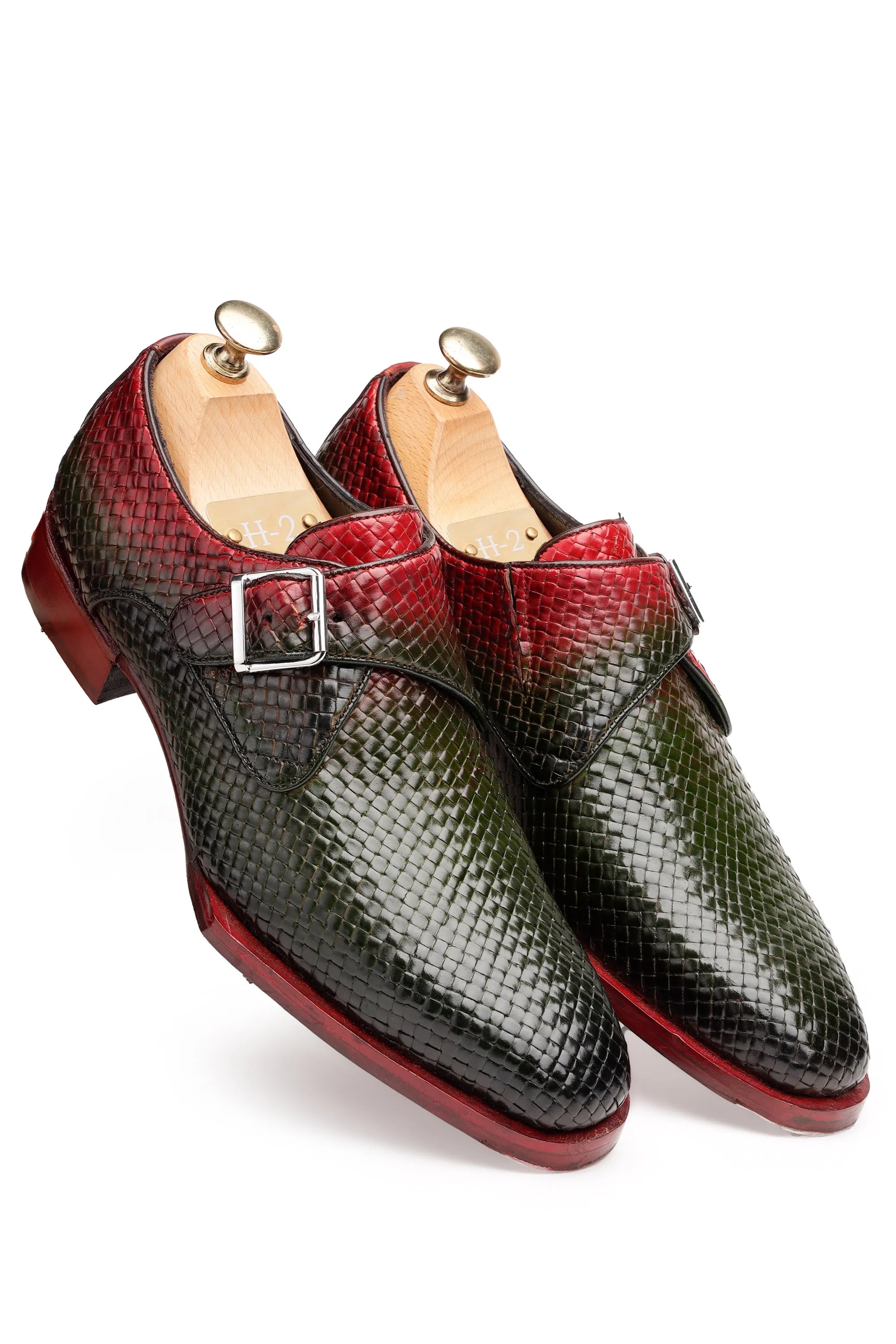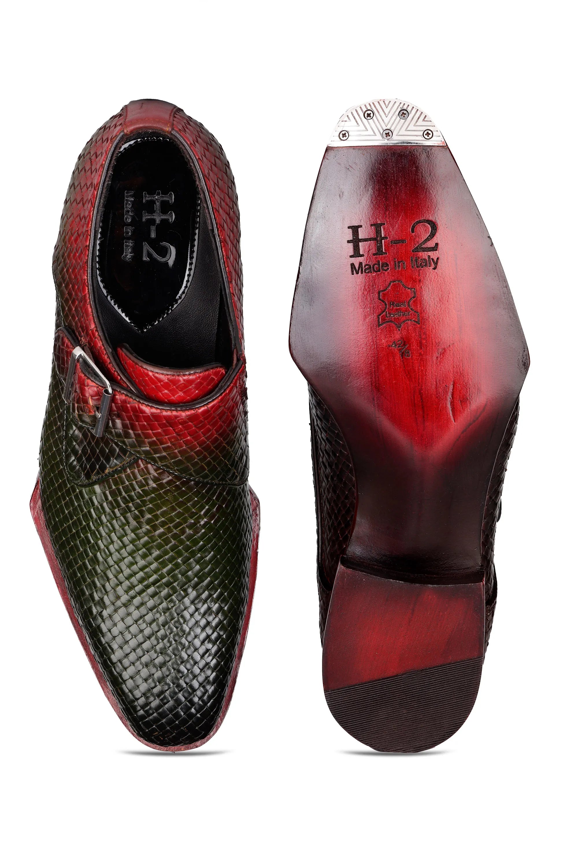 These two-tone leather shoes feature a rich red and dark mehndi-green blend with a stylish python-texture finish. The hand-polished shine and single-buckle closure add elegance, while the sleek design makes them ideal for weddings, parties, and premium formal wear.