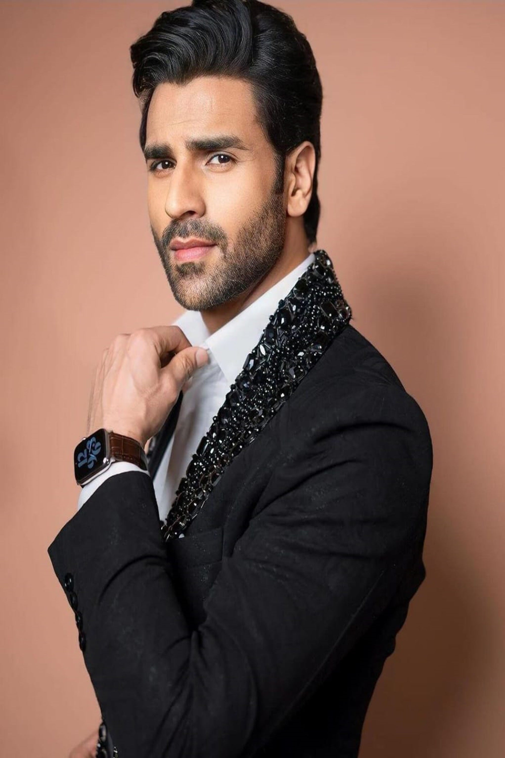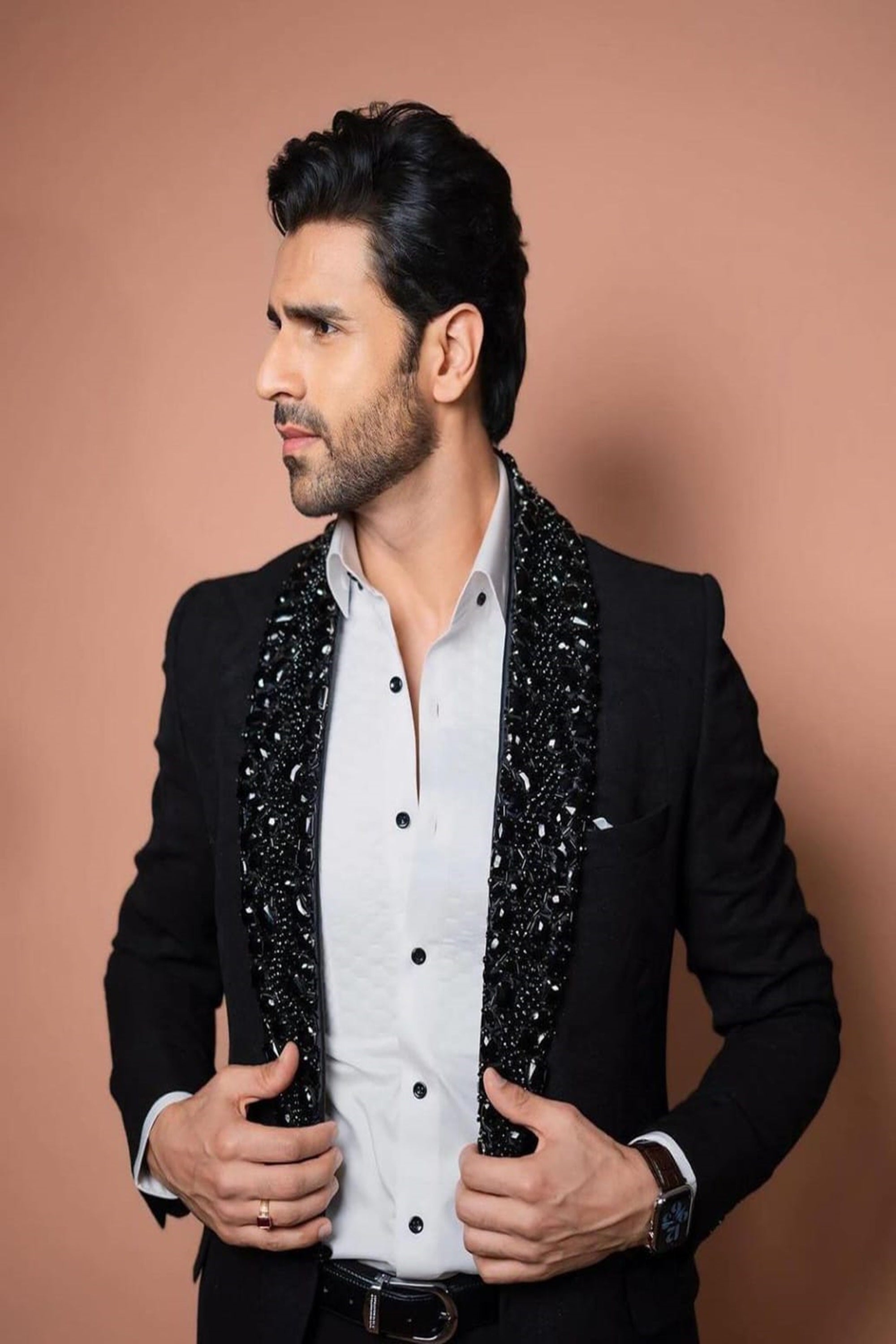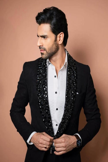Vivek Dahiya looks dashing in designer rich black blazer with stud work by Bharat Reshma - crafted for a bold, refined look with striking detail and modern elegance.